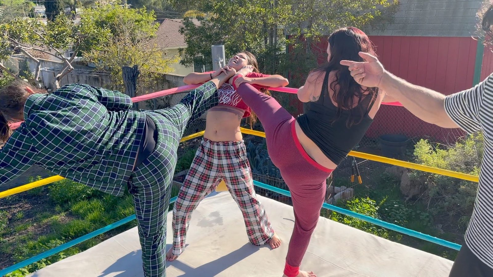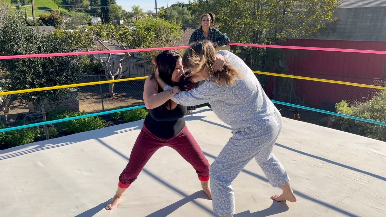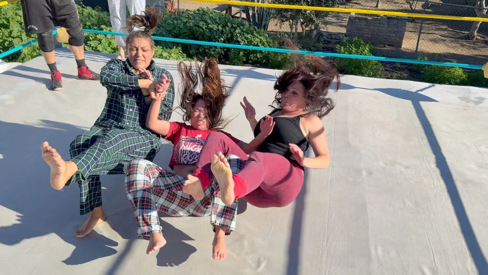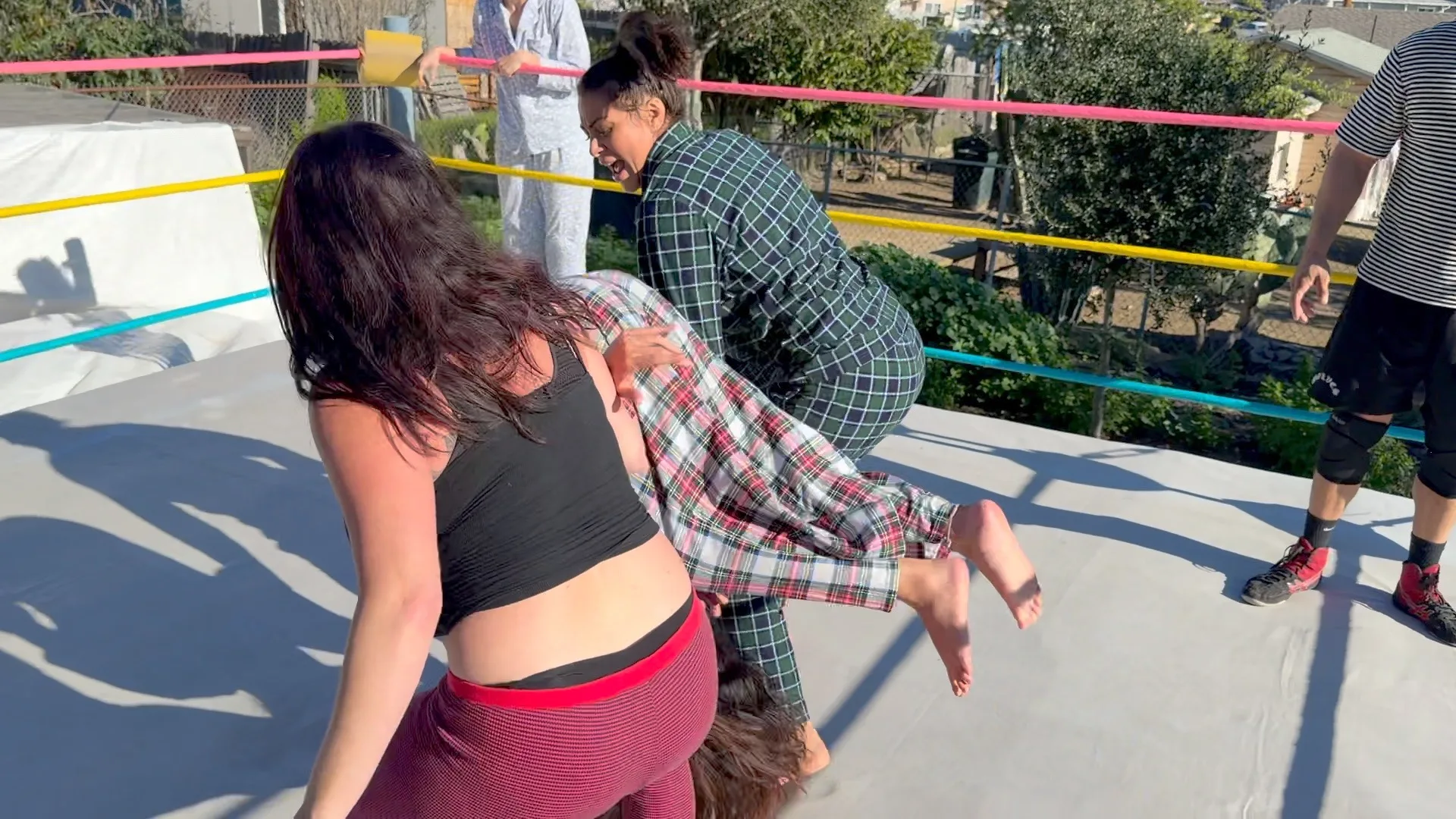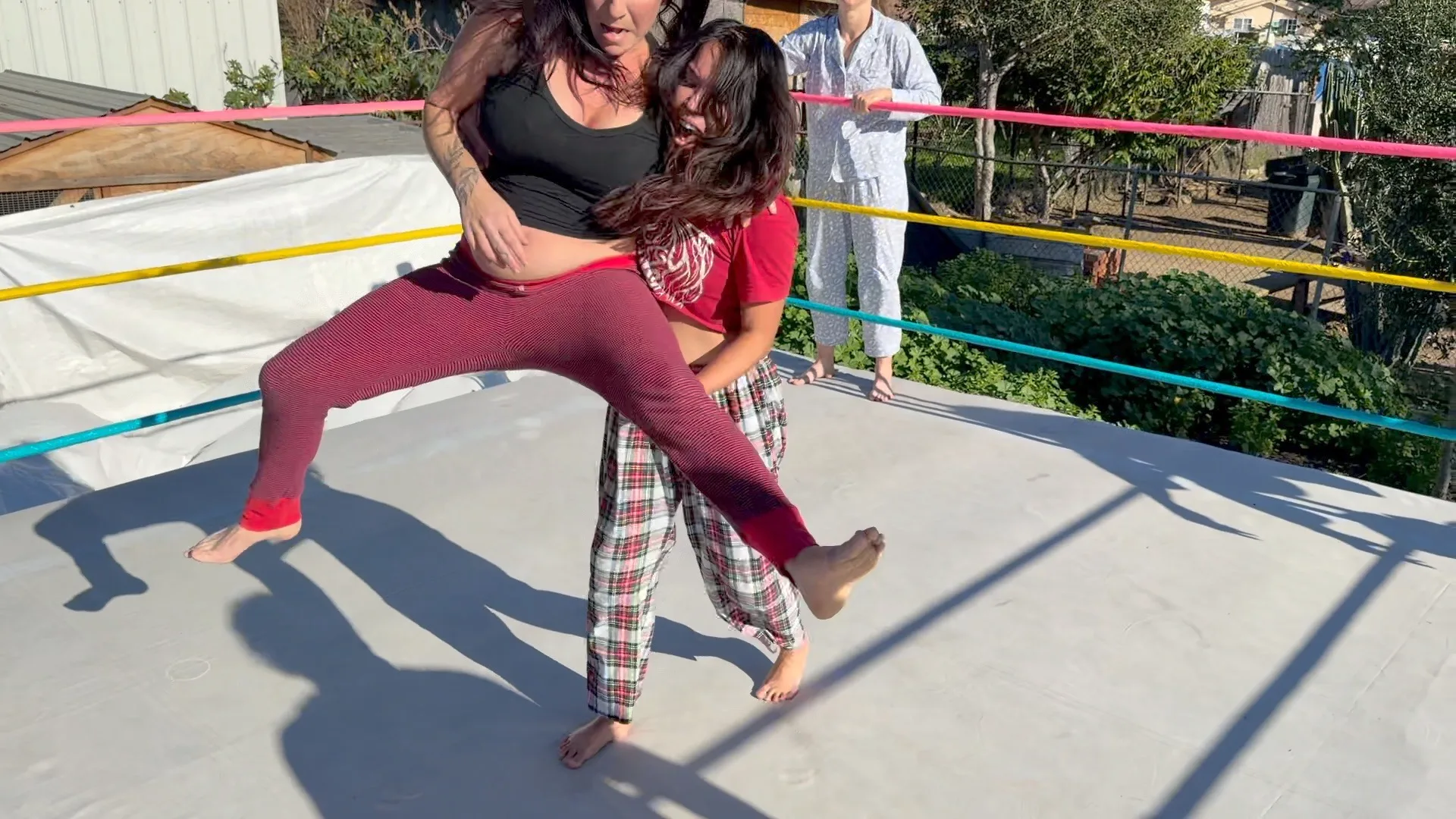 Beckie and Nikki tewam up against The Big D and Stevie.  Both teams are battling it out in their PJs with many pro style moves.  12 min 14 sec
