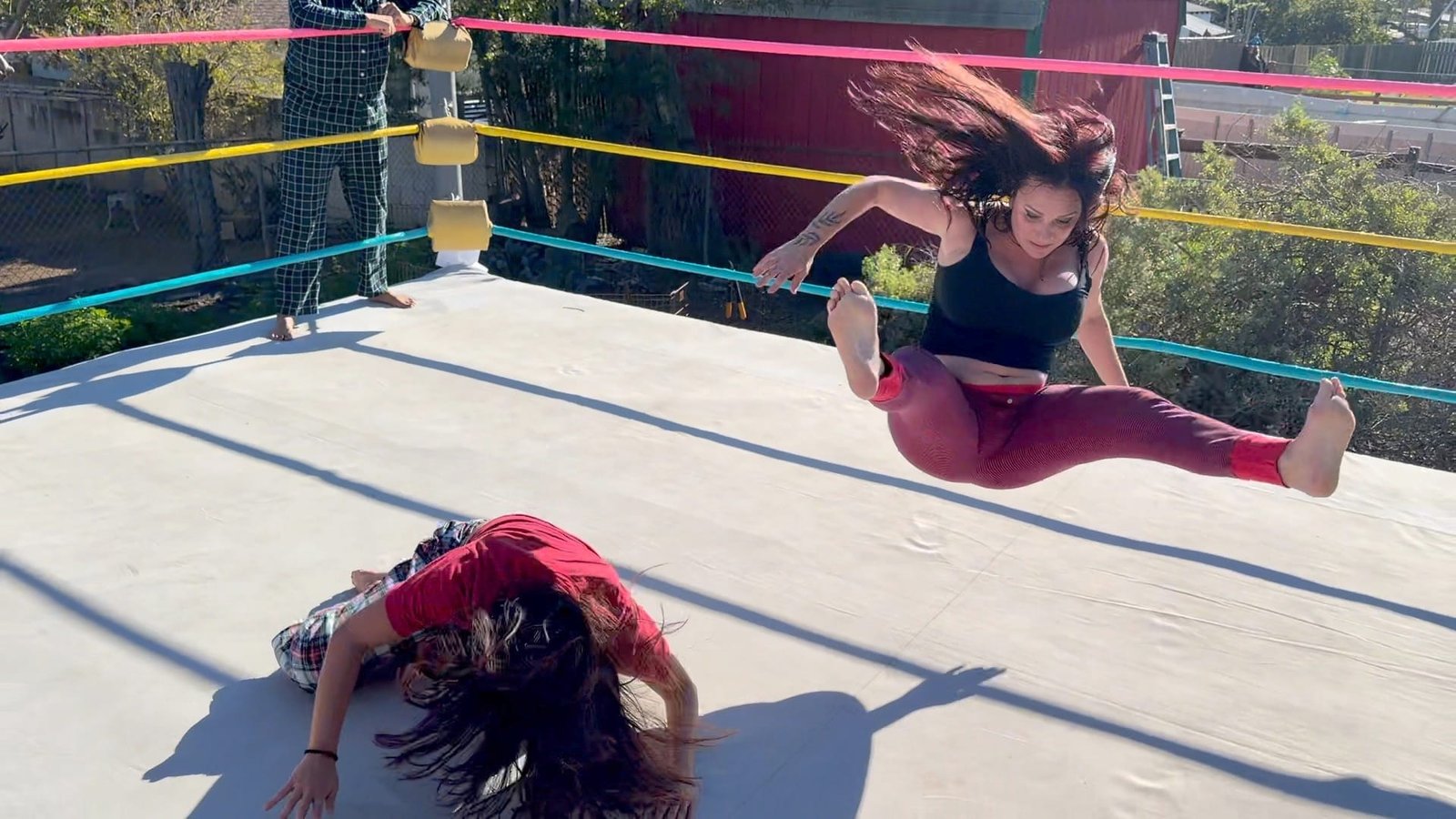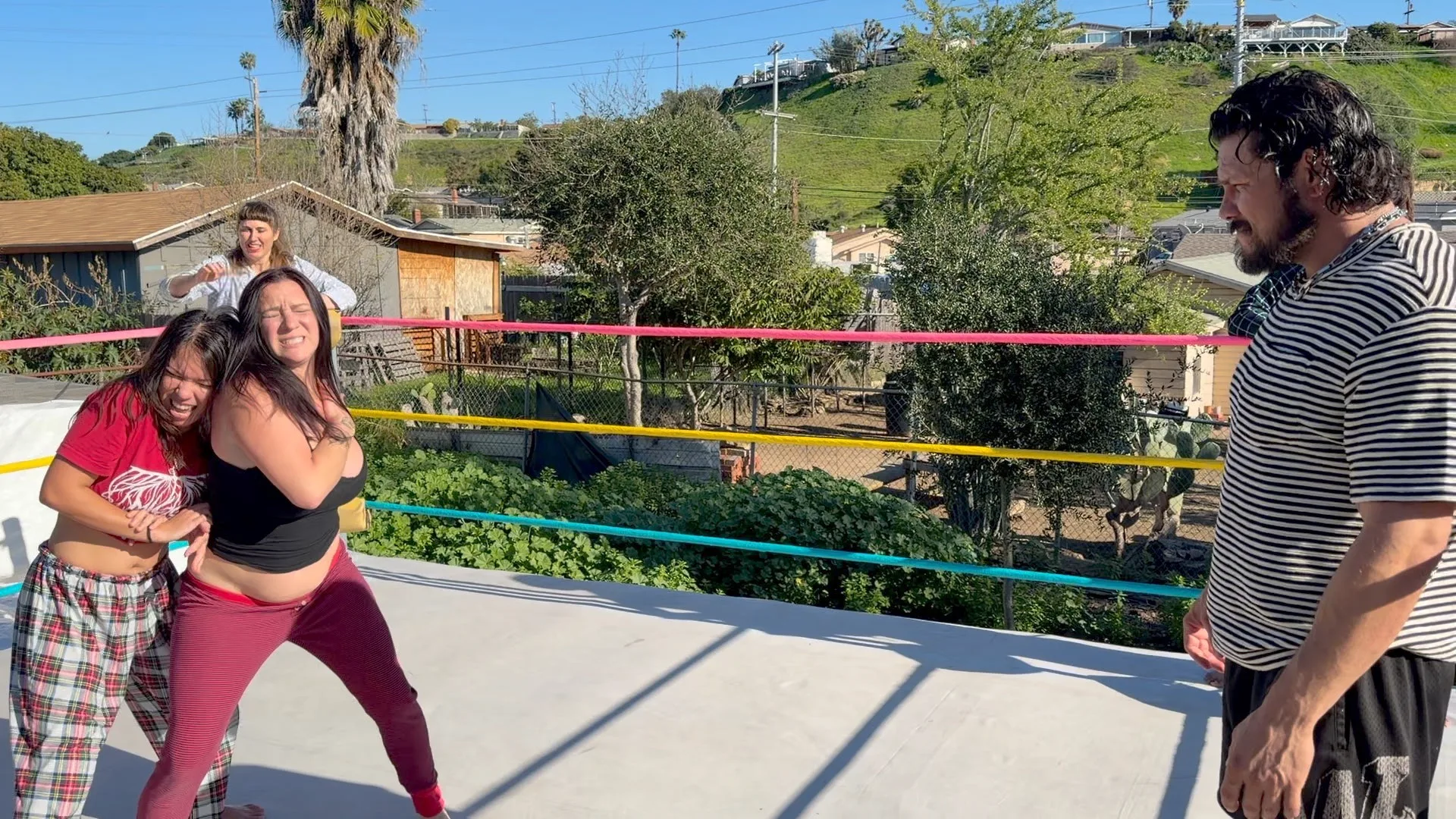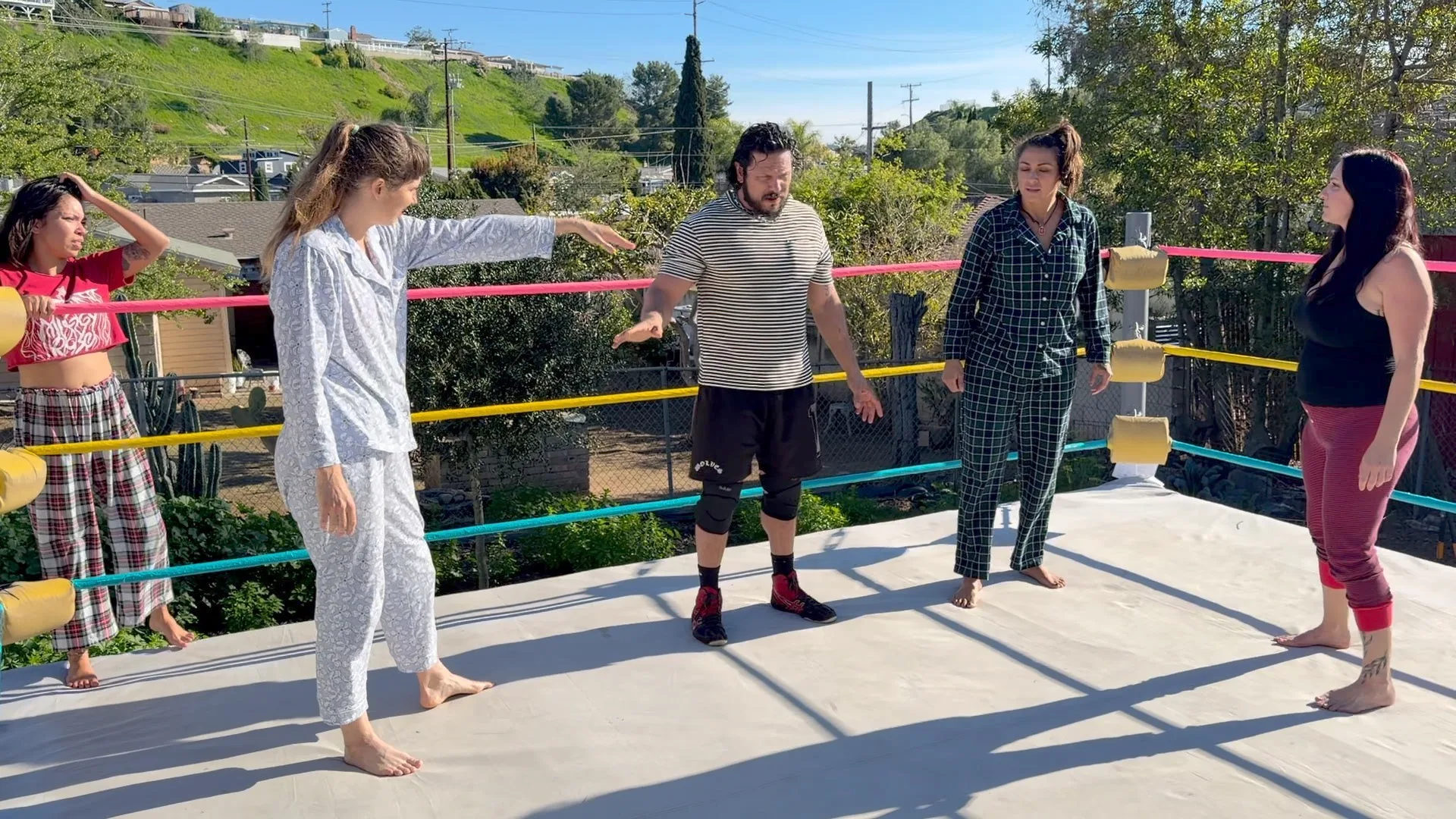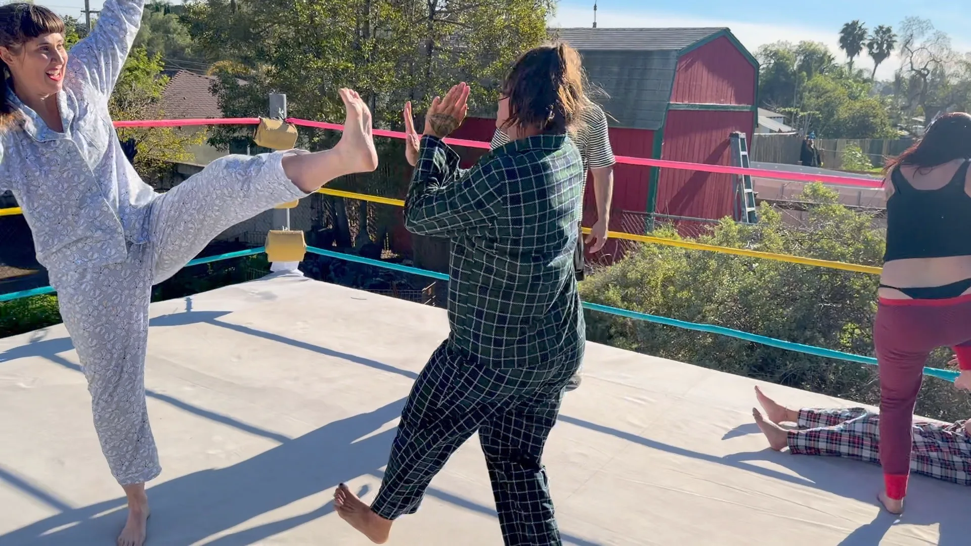 Beckie and Nikki tewam up against The Big D and Stevie.  Both teams are battling it out in their PJs with many pro style moves.  12 min 14 sec