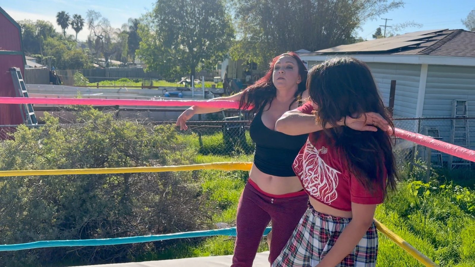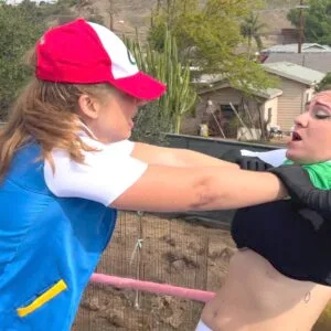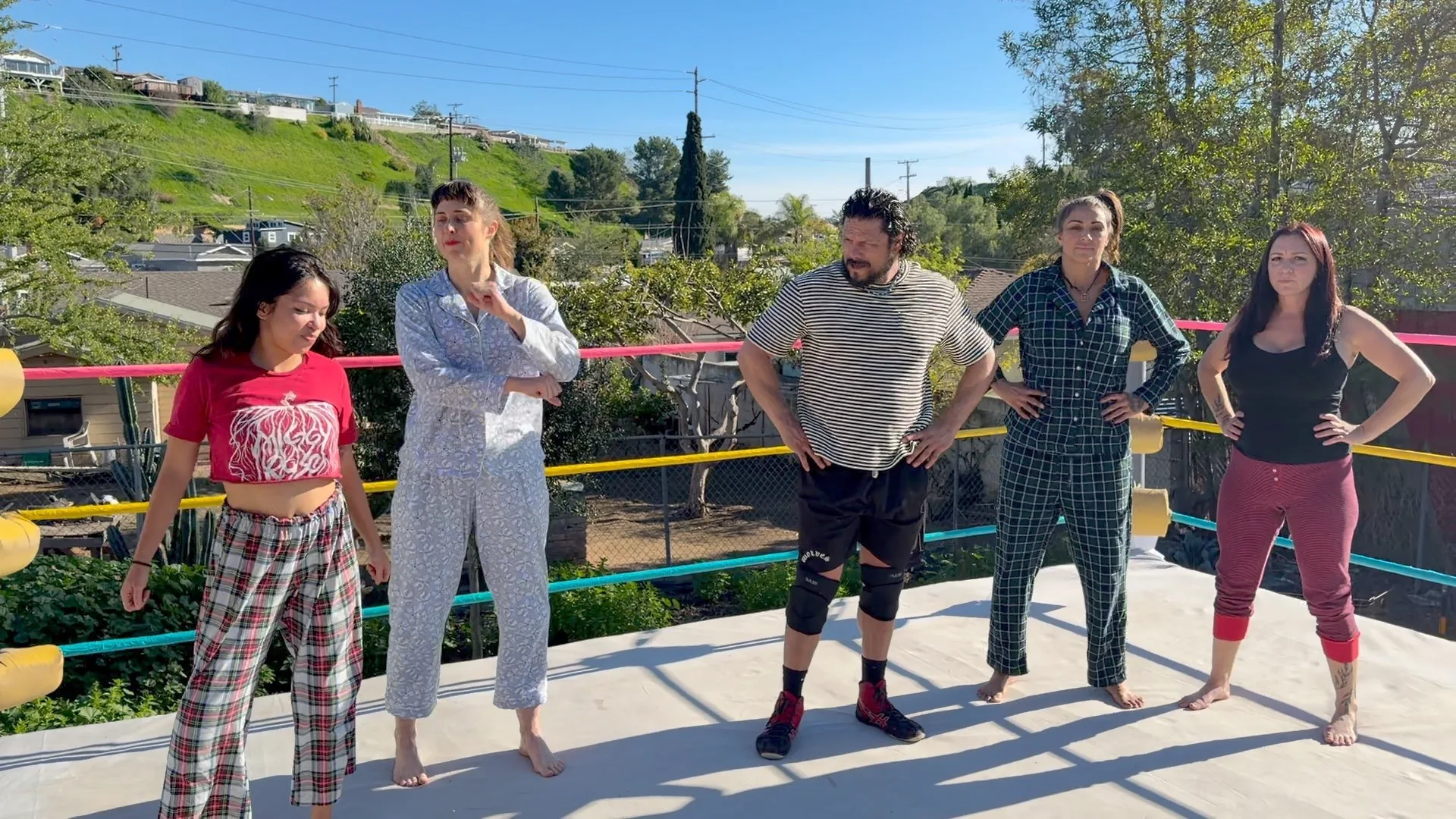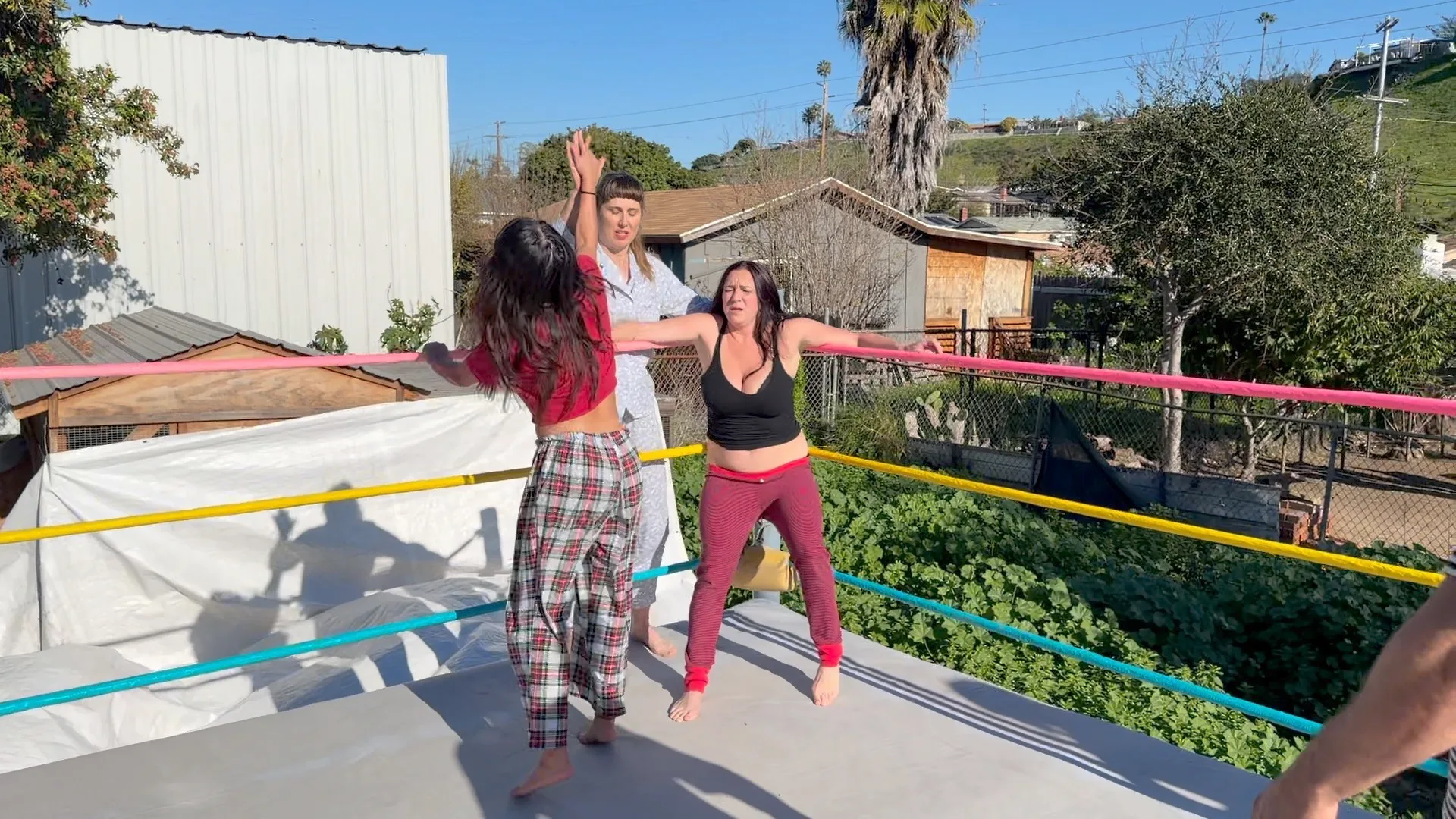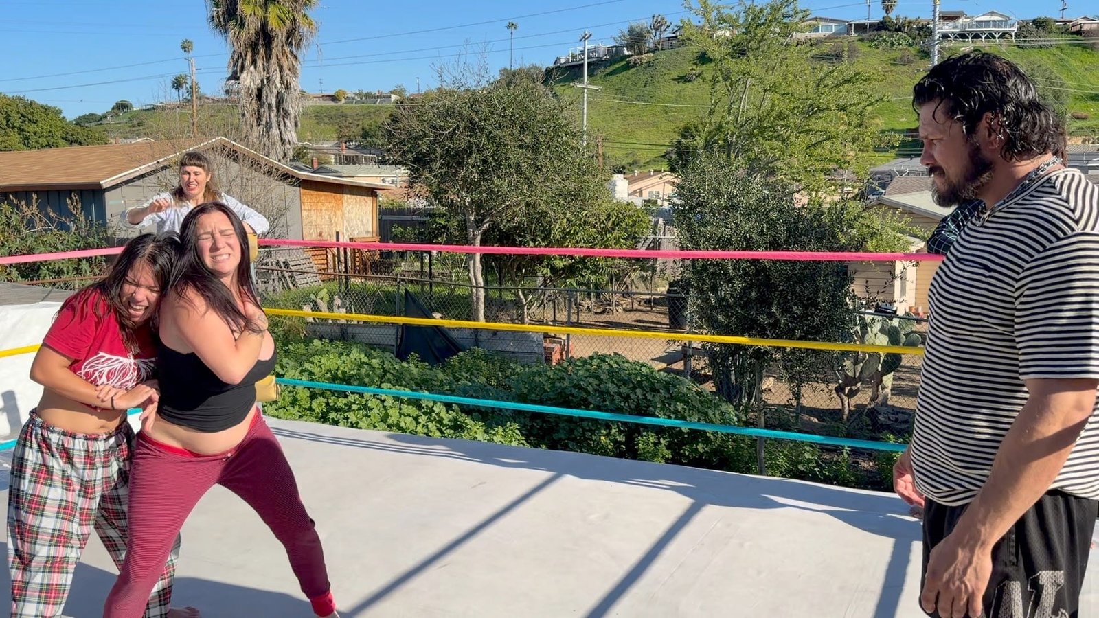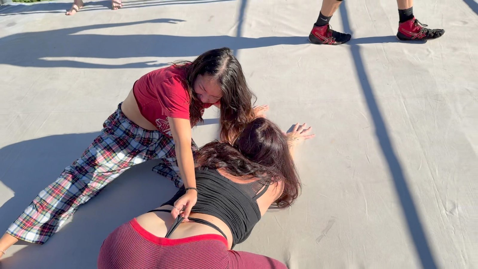 Beckie and Nikki tewam up against The Big D and Stevie.  Both teams are battling it out in their PJs with many pro style moves.  12 min 14 sec