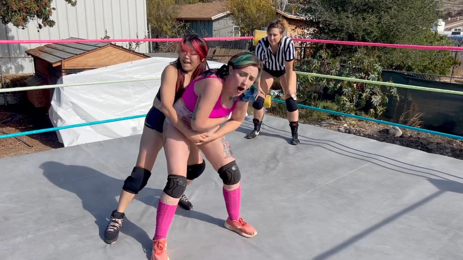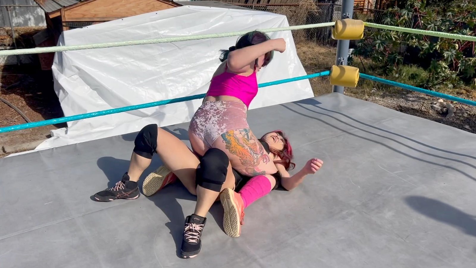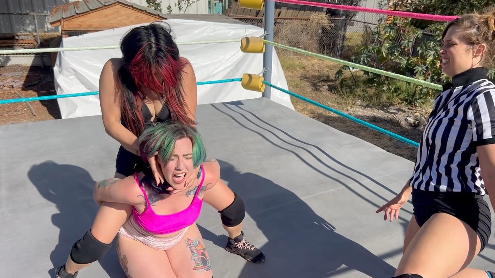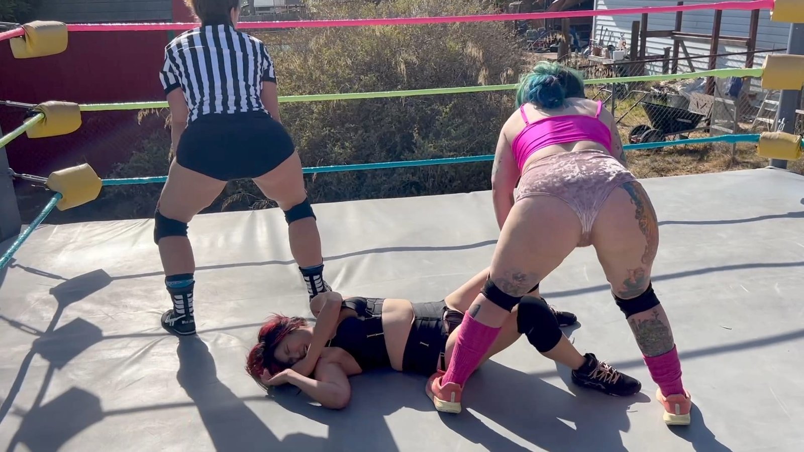 Morrigan Moxie pins Cee Cee in multiple sexy straddle pins and with a little help for the referee, Beckie Wreckie! 10 min 37 secs