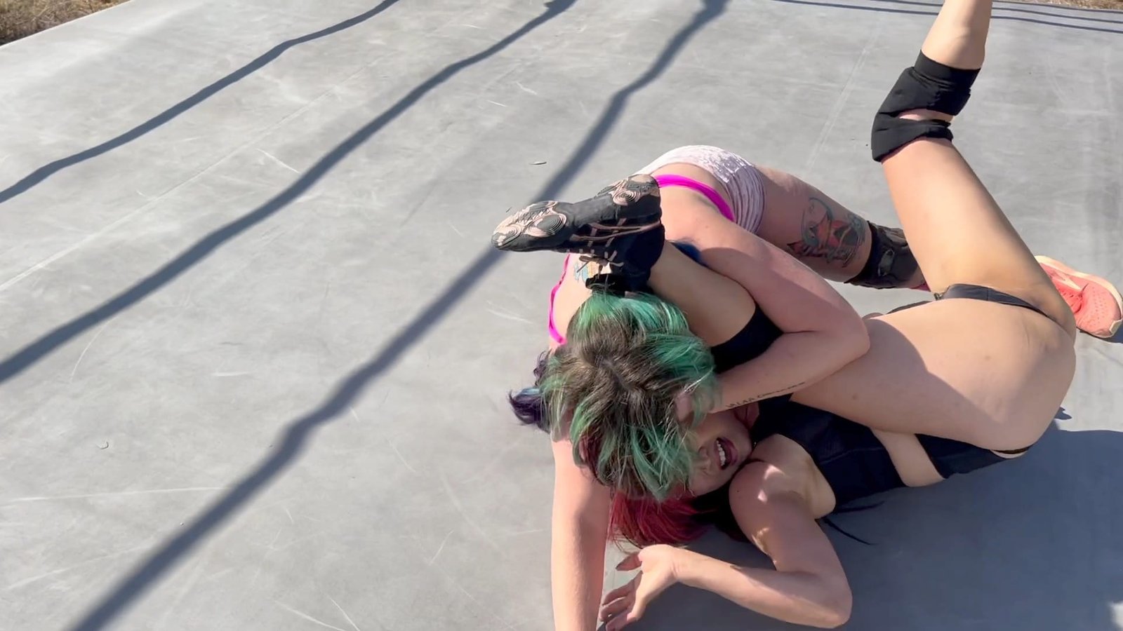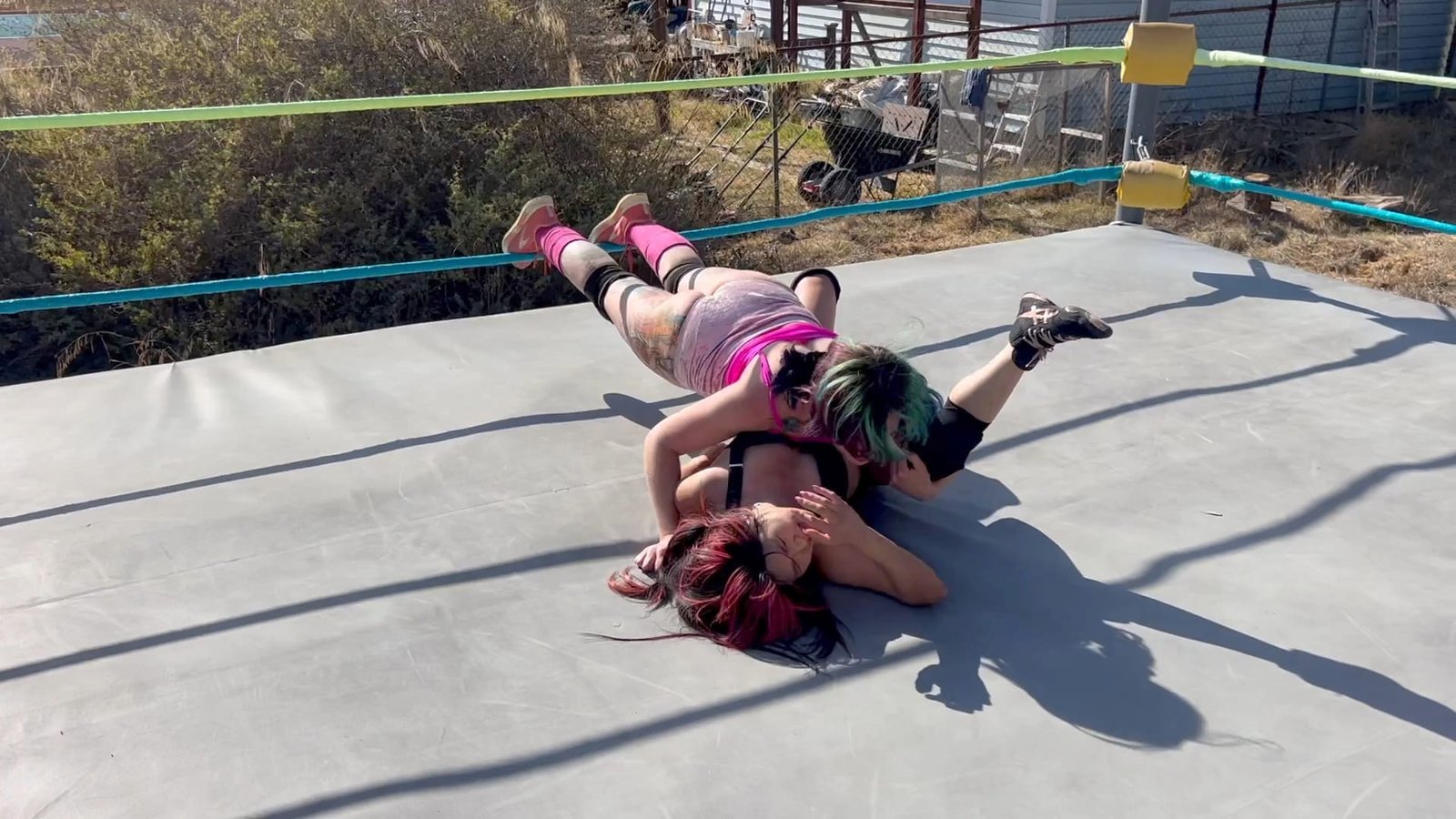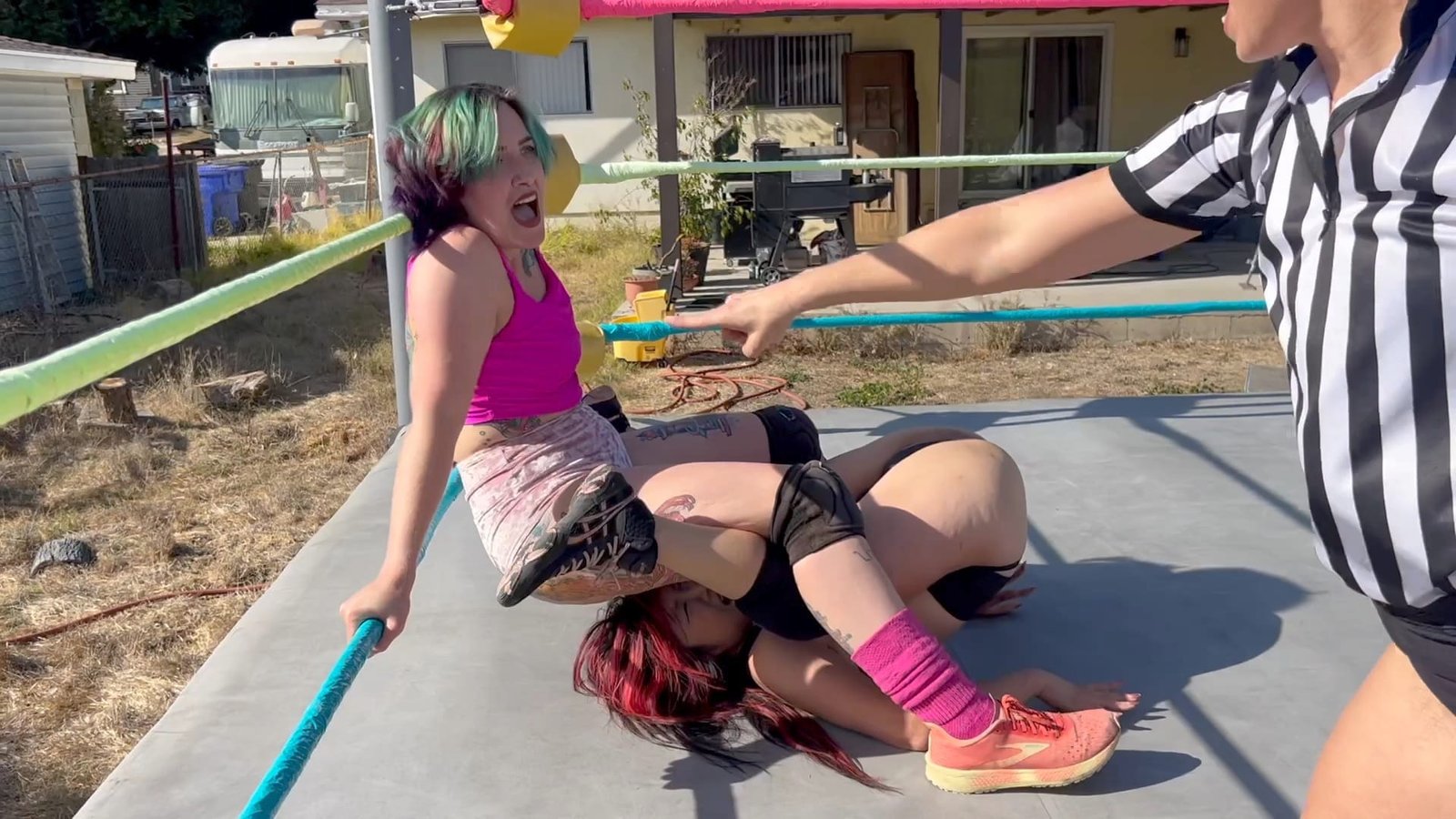 Morrigan Moxie pins Cee Cee in multiple sexy straddle pins and with a little help for the referee, Beckie Wreckie! 10 min 37 secs