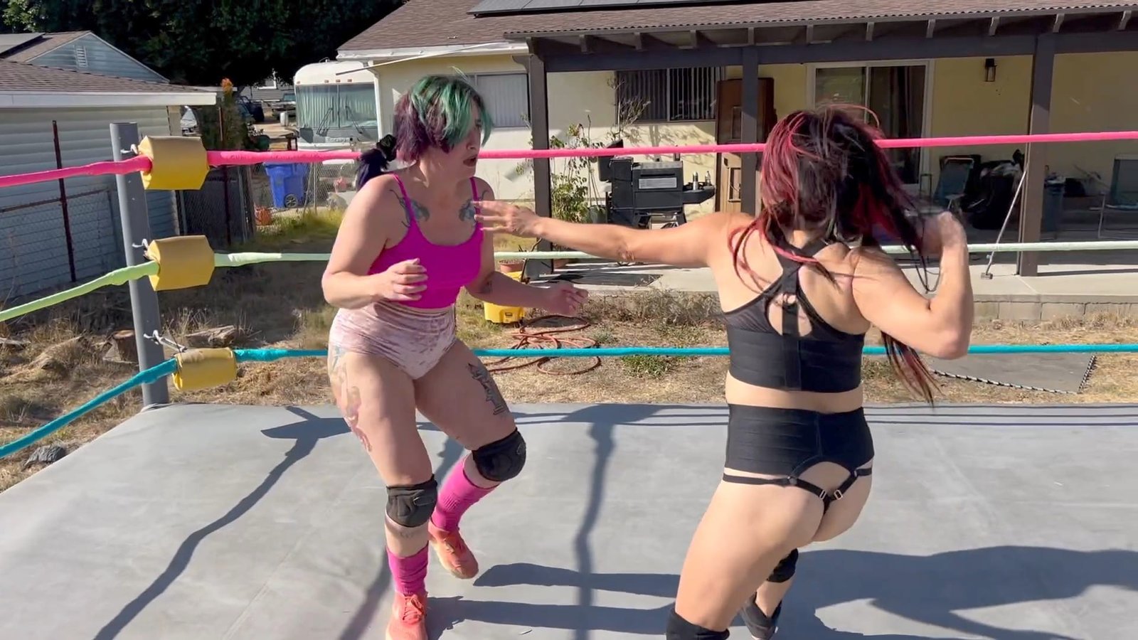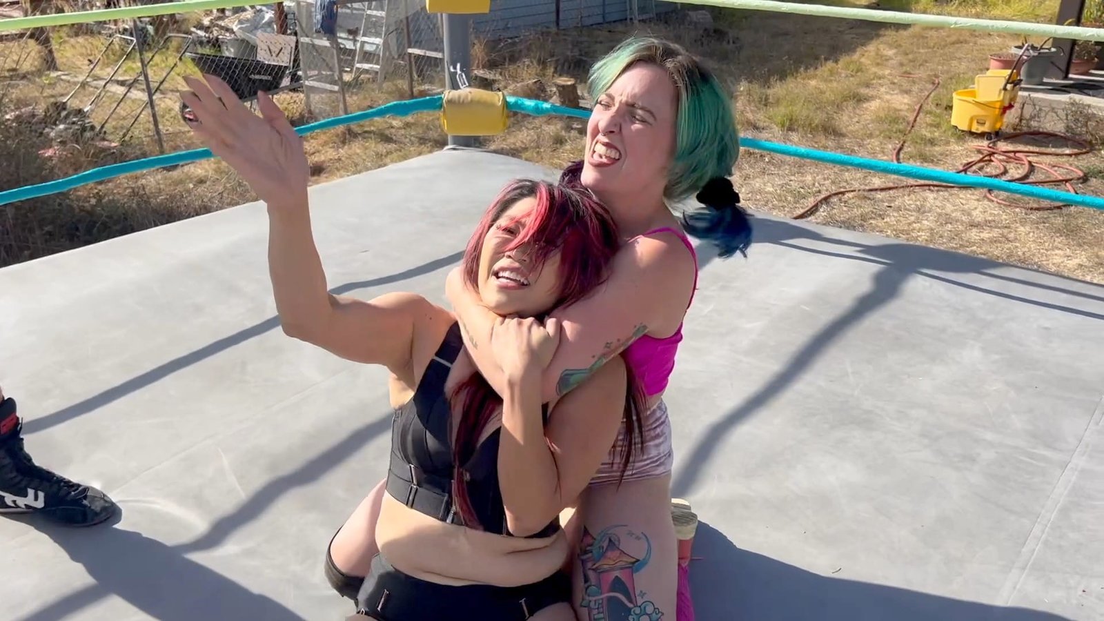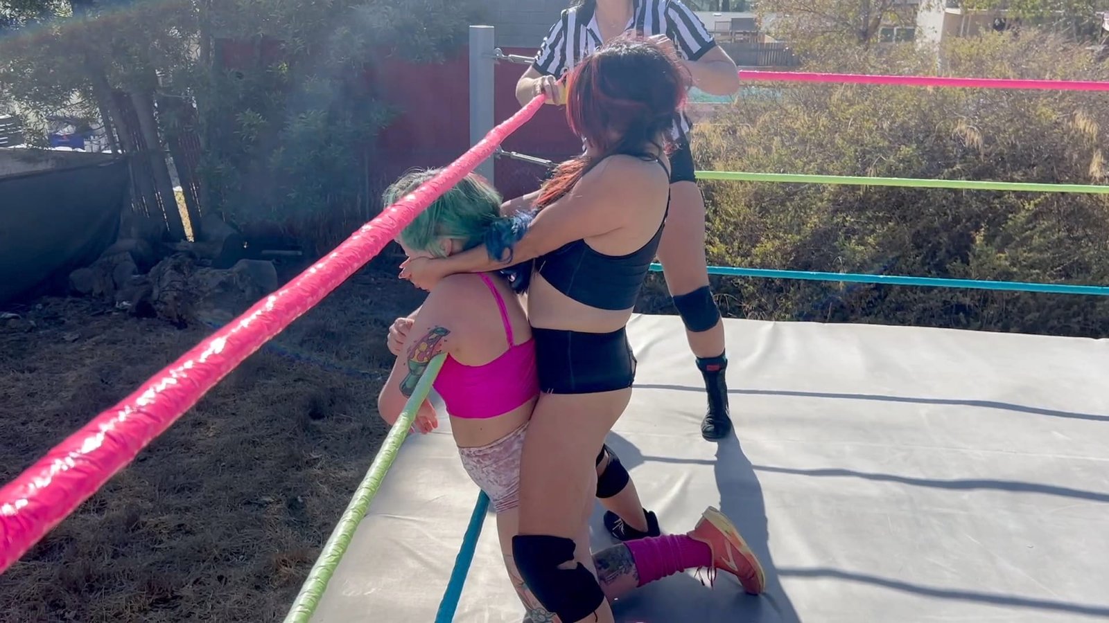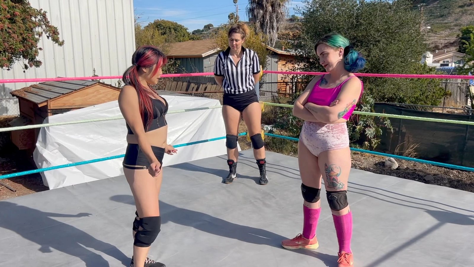 Morrigan Moxie pins Cee Cee in multiple sexy straddle pins and with a little help for the referee, Beckie Wreckie! 10 min 37 secs