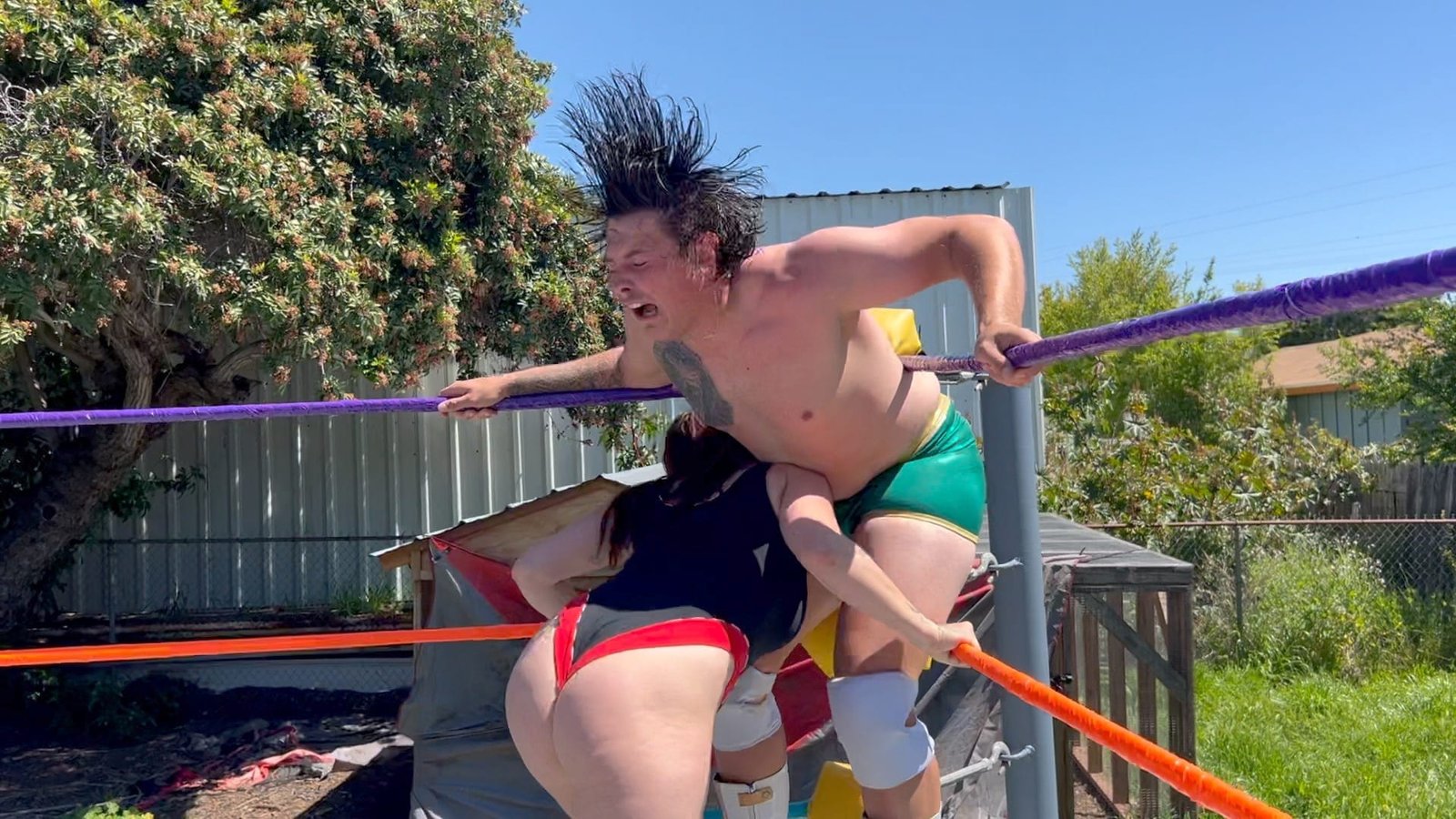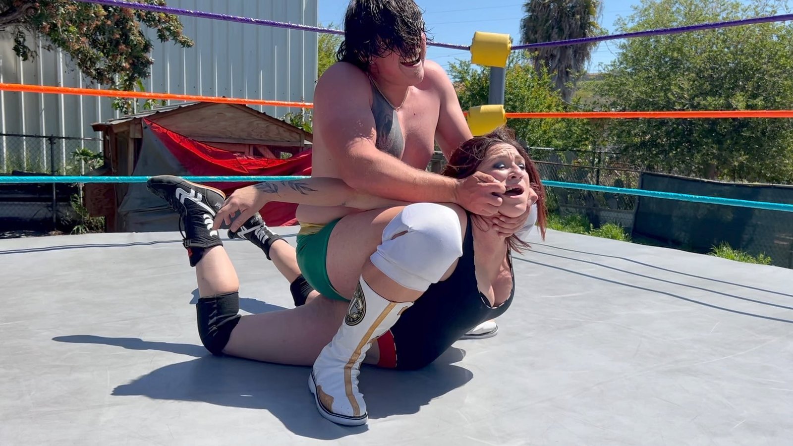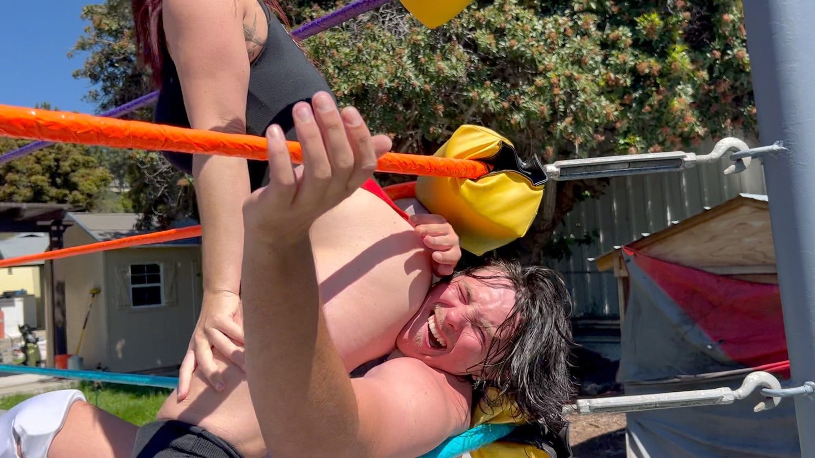 Stevie pays back Cody’s Bronco Buster with a Bronco Buster of her own. But that’s not enough! She gives herself a nice Camel Toe and gives him another brutal Bronco Buster! Then she spanks him over the ropes! Cody comes back and gives her a Piledriver, but she lkicsk out! He tries to go for another one but she farts in his face! 10 min 19 sec