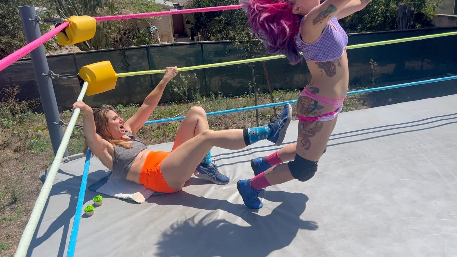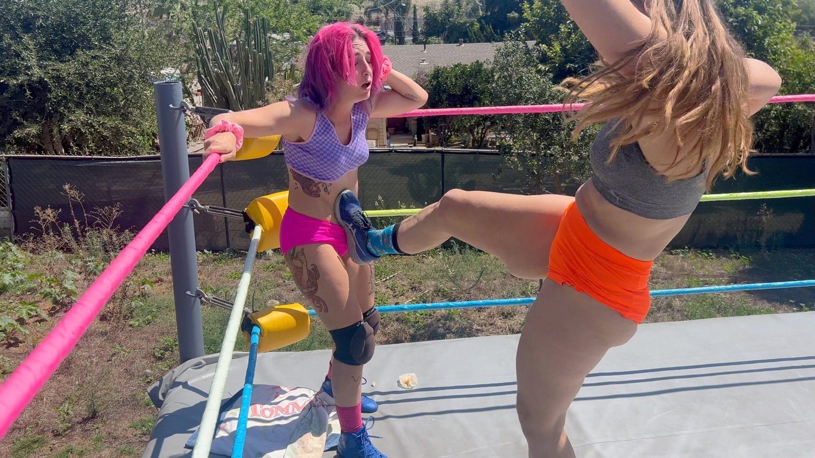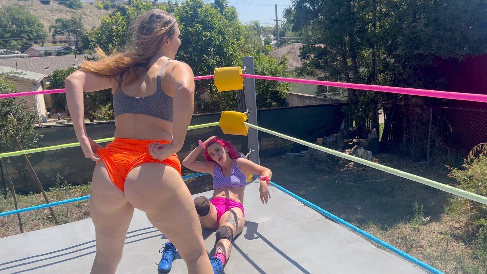 Beckie is enjoying a cupcake in the ring when all of a sudden Morrigan gets inthe ring and gives her two Stinkfaces.  Beckie is so made that she gives Morrigan multiple stinkfaces even grinding the cupcake into Morrigan’s face with her ass.