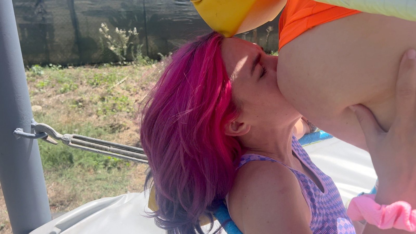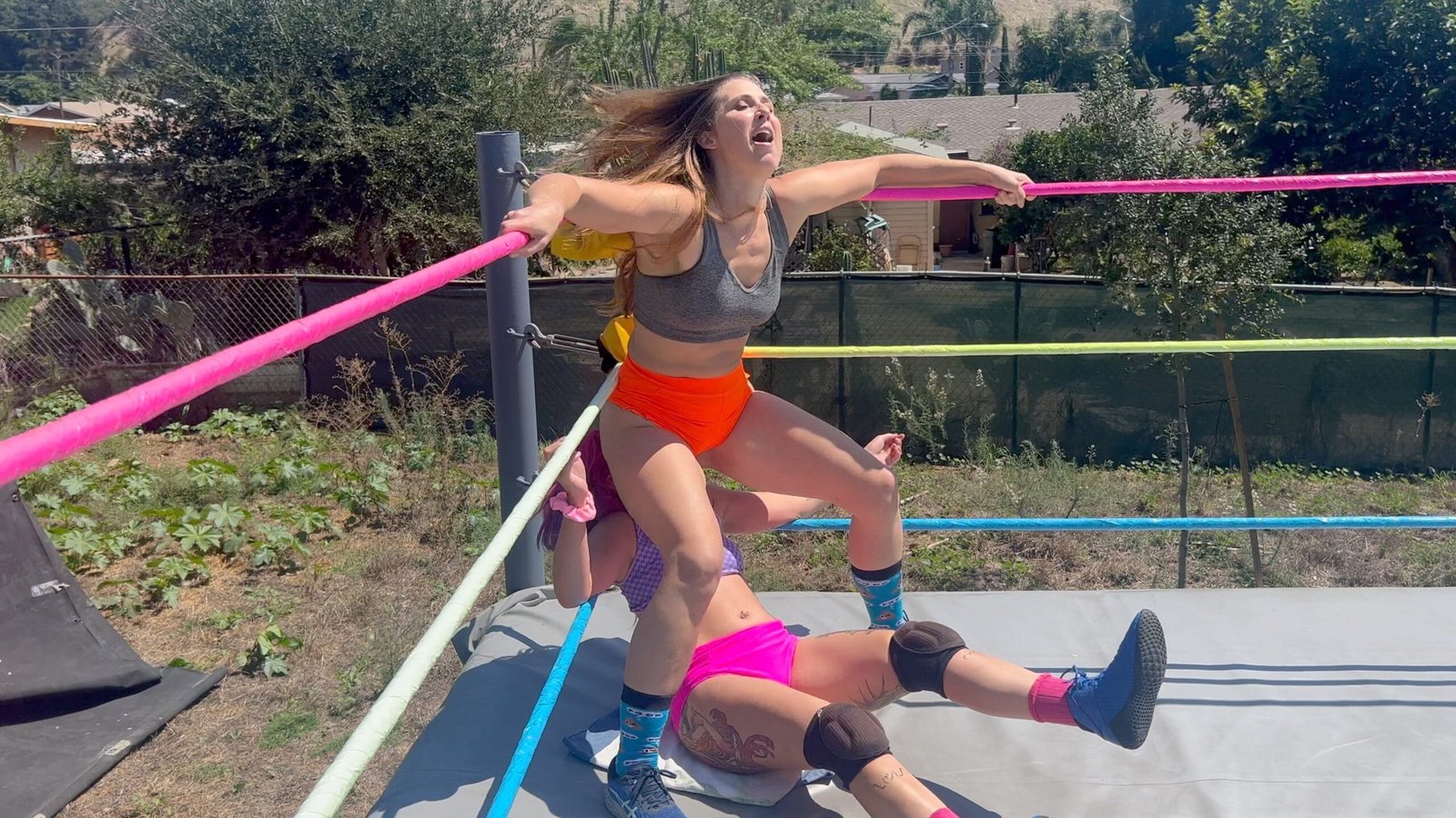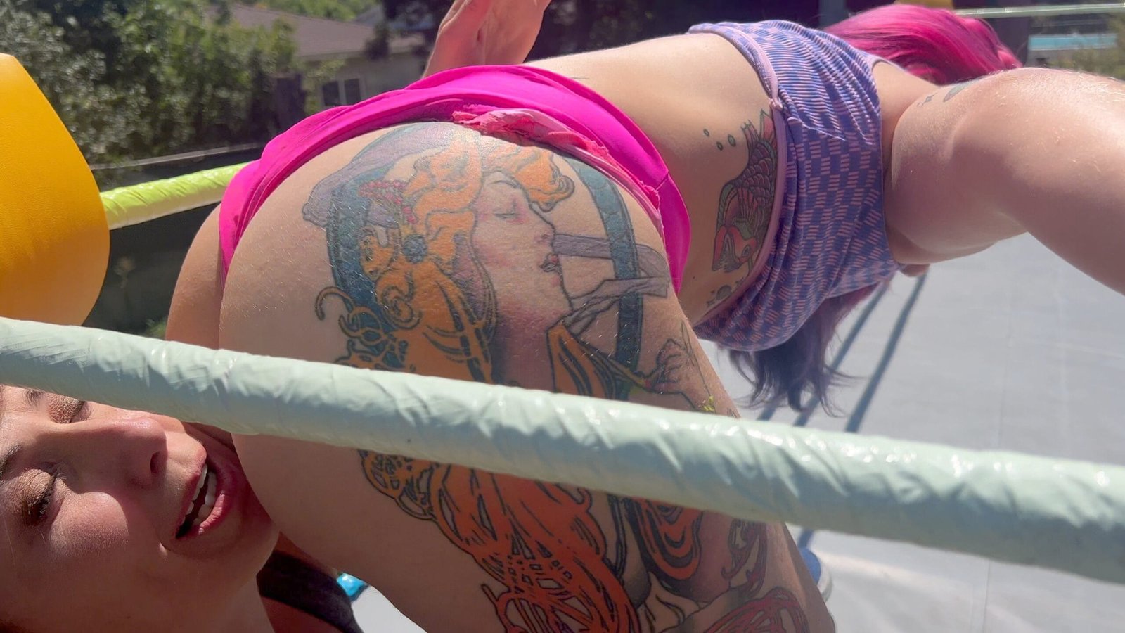 Beckie is enjoying a cupcake in the ring when all of a sudden Morrigan gets inthe ring and gives her two Stinkfaces.  Beckie is so made that she gives Morrigan multiple stinkfaces even grinding the cupcake into Morrigan’s face with her ass.