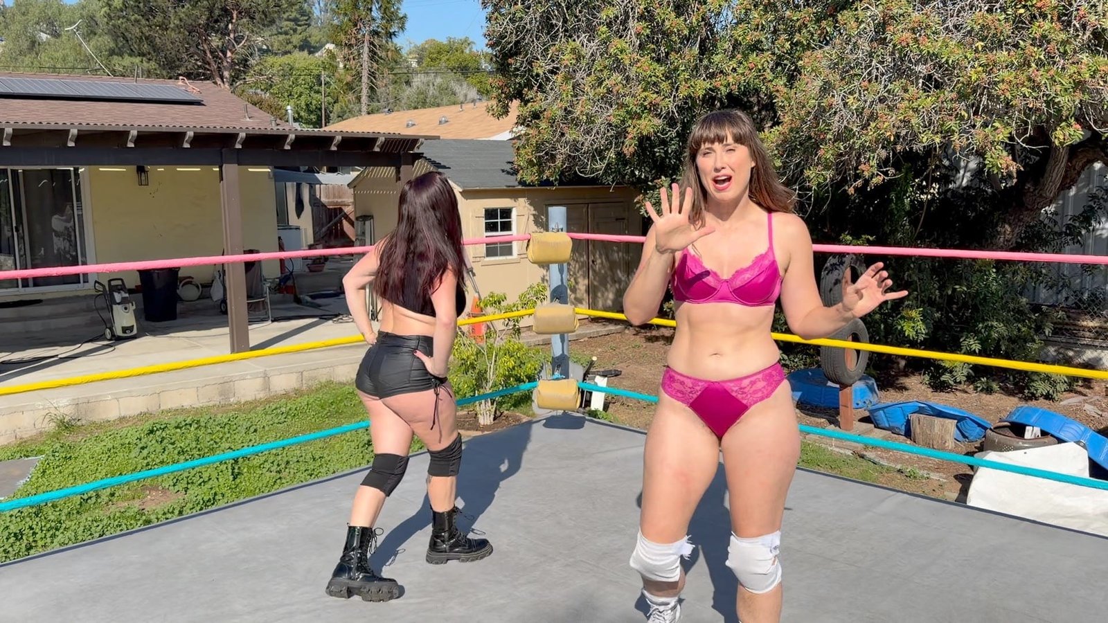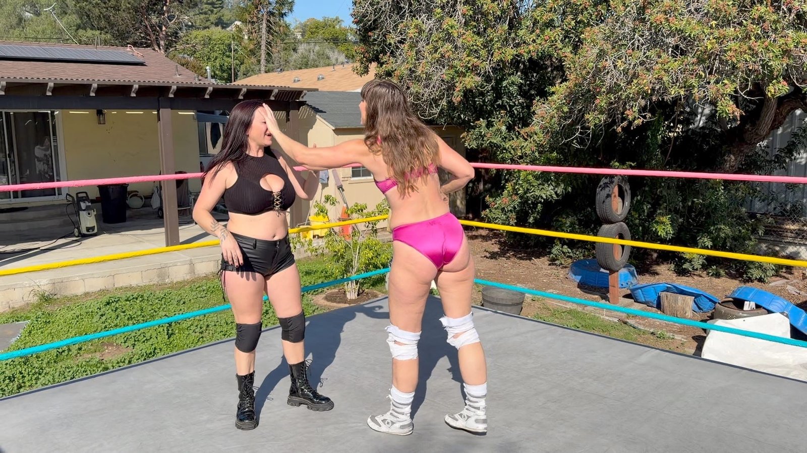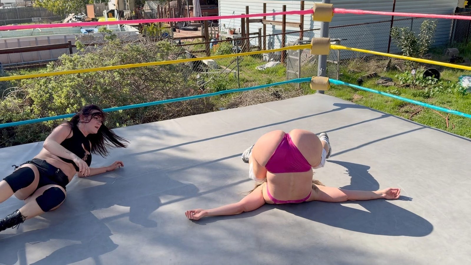 Beckie is being very cocky and tells Stevie that she can pin her five times for a 5-count each time.  Stevie accepts the challenge and then proceeds to kick Beckies butt, pinning her five times each time for a 5-count.  10 min 34 sec
