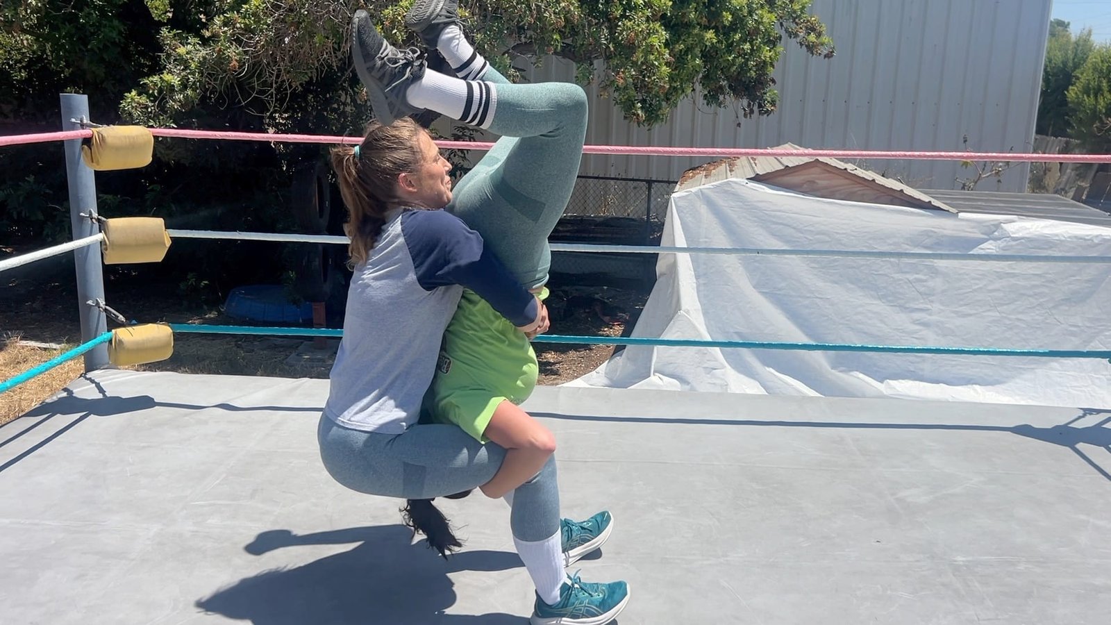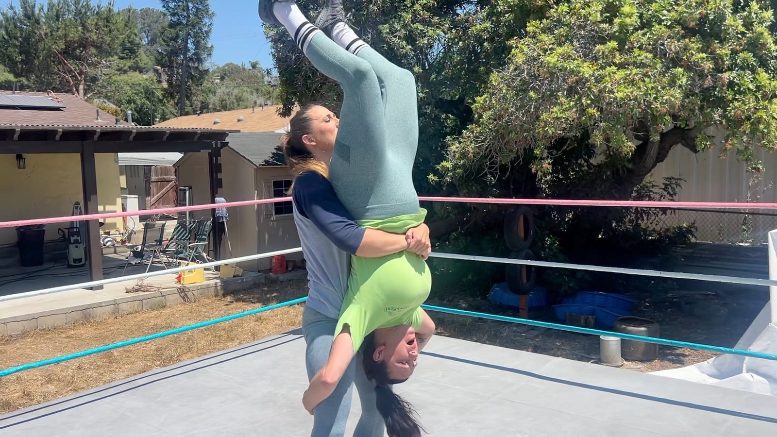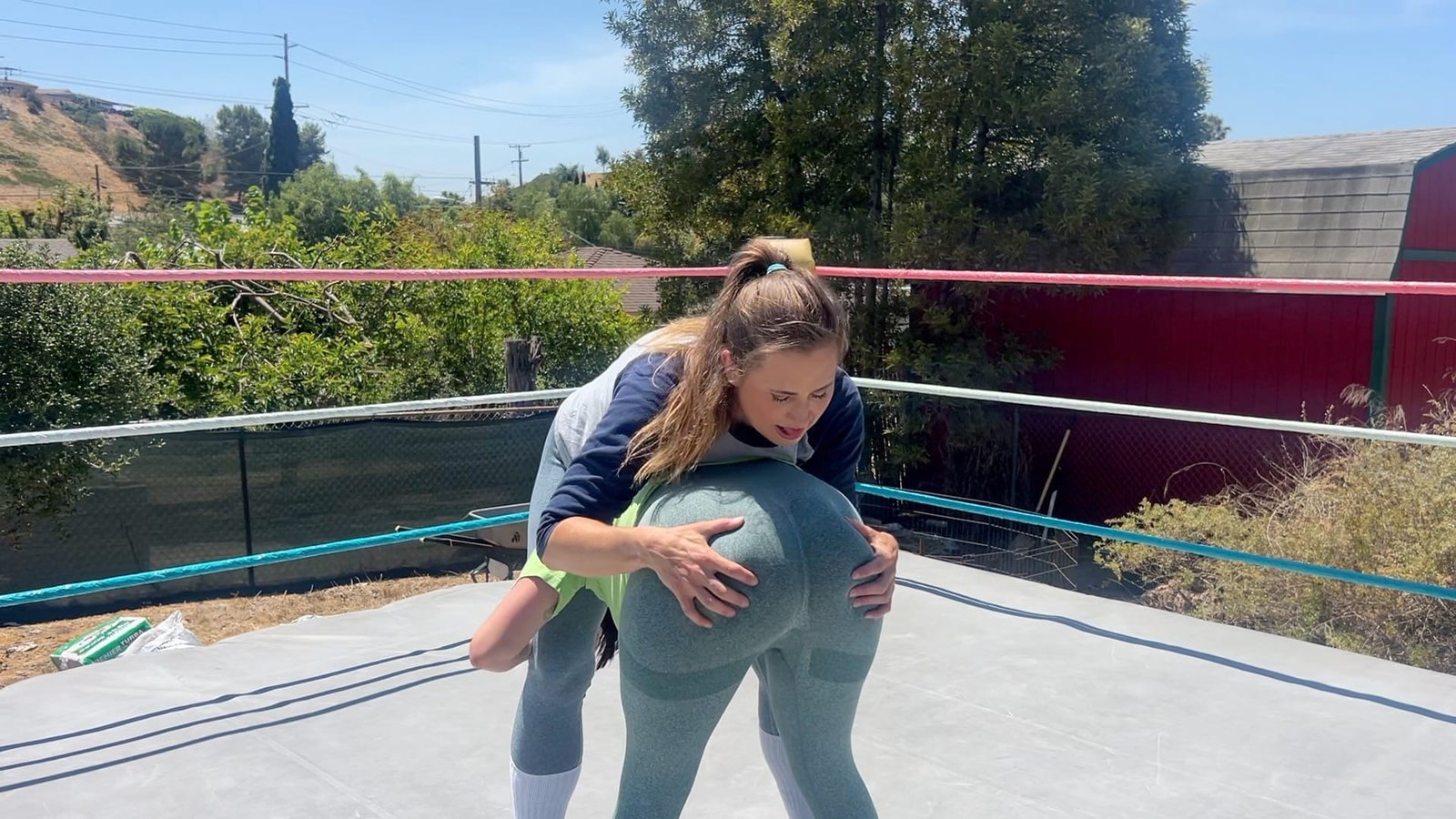 Once again, Stevie and Beckie are in gym class, arguing over who can give and take Piledrivers in the sexiest way because they both have a crush on the same guy.  They take turns shoving the other’s head between their thighs, then grinding and humping on their head and shoulders, while also playing with their butt and spanking them.  10 min 56 sec