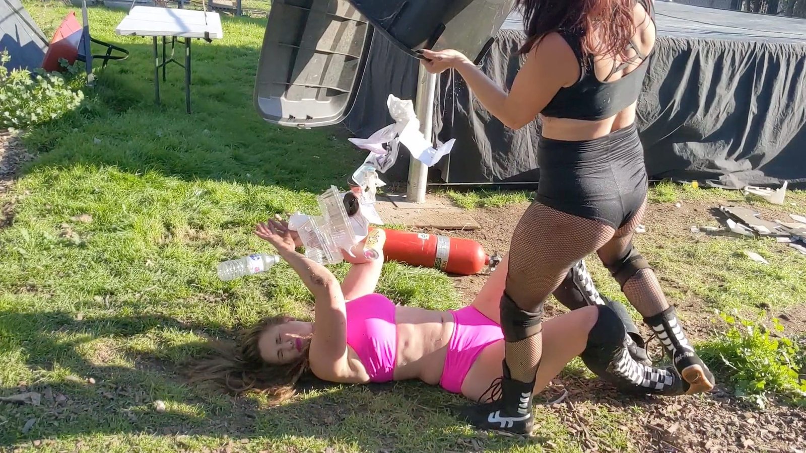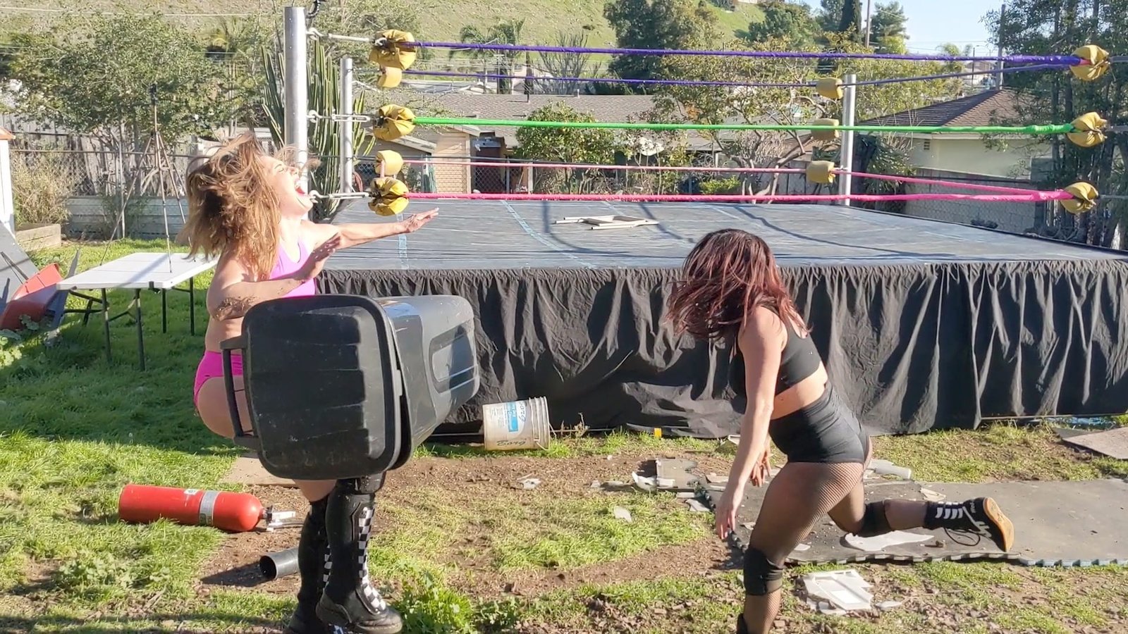 lawyer watching her back — face off in a wild No DQ backyard wrestling match with $100 on the line!
