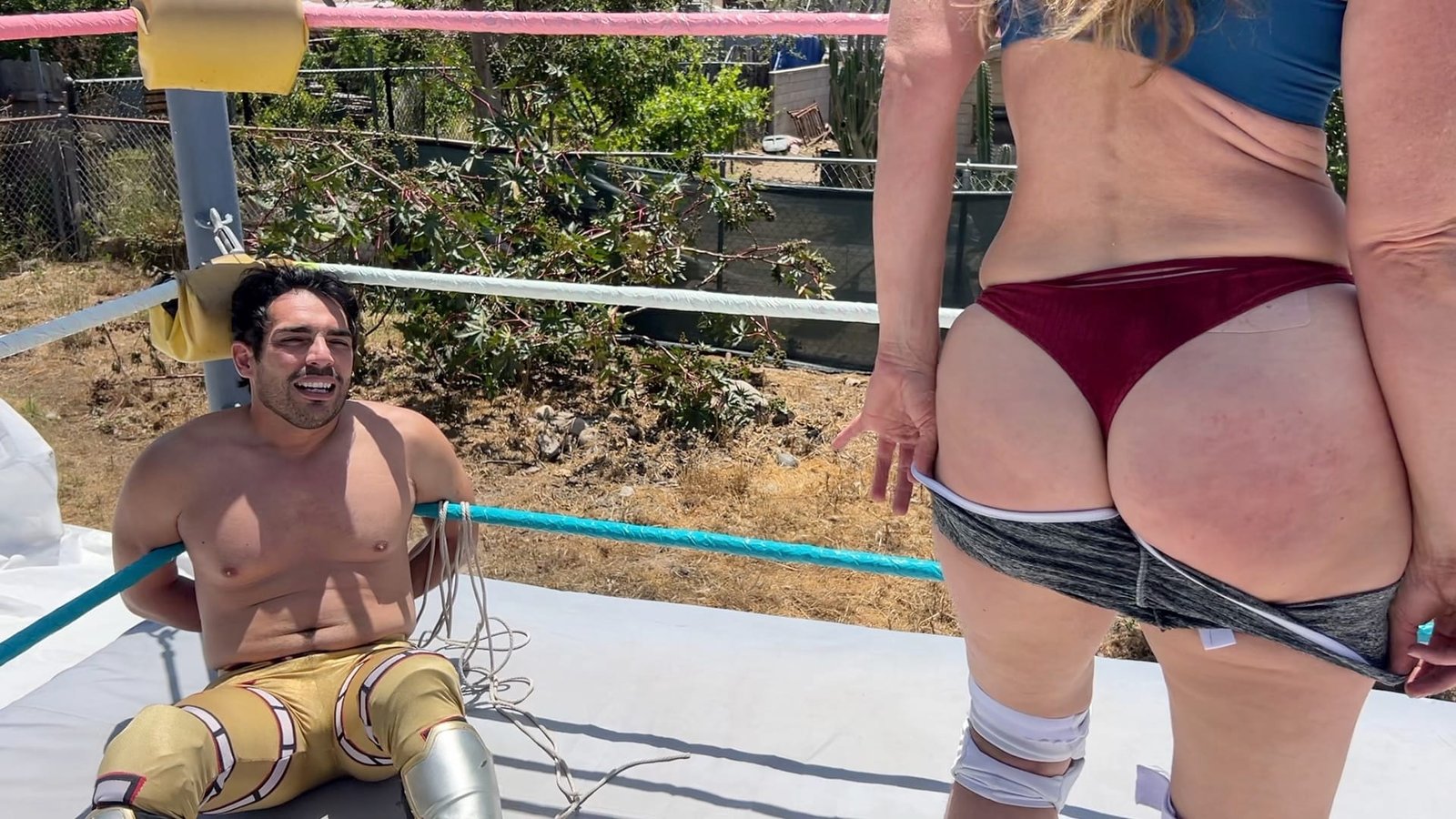 Beckie believes she can give Vic a Stinkface that is so devastating, that he will quit wrestling. Vic agrees to wrestler her but if he wins she has to quit. After some amount of back and forth, Beckie pummels Vic in the corner so that she’s able to tie him up and Stinkface him, but he won’t quit. Now she must Stinkface him over and over again continuously asking him if he quits. After Beckie removes her shorts and Stinkfaces Vic in just her sweaty thong he finally relents. Now that he has capitulated, he must kiss Beckies big sweaty ass, over and over until she says stop! 20 min 2 sec