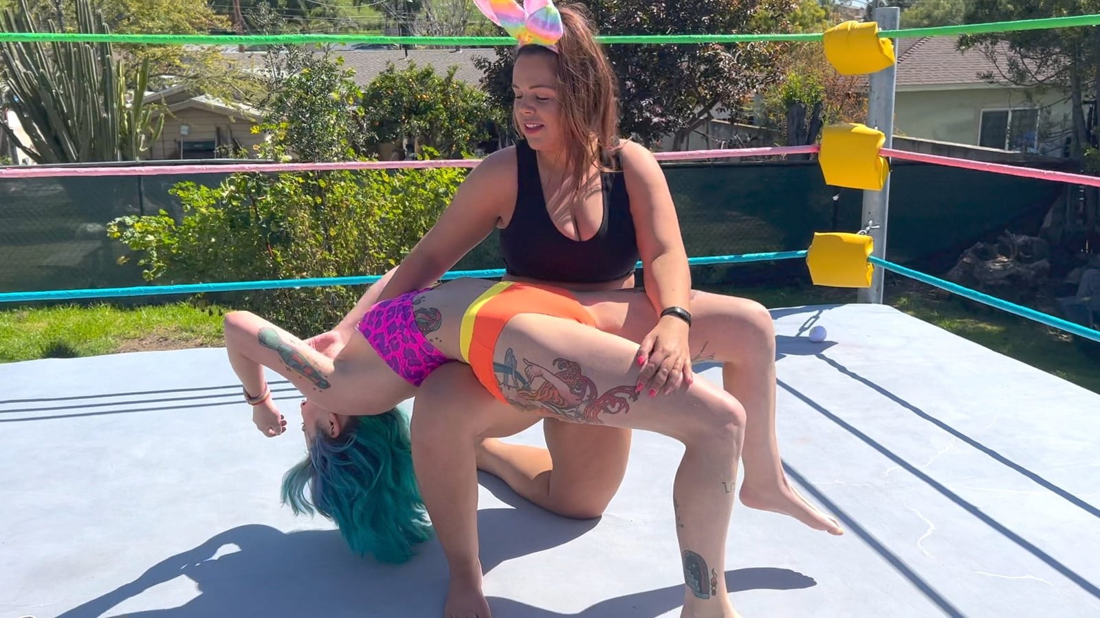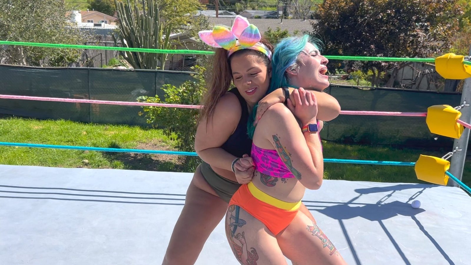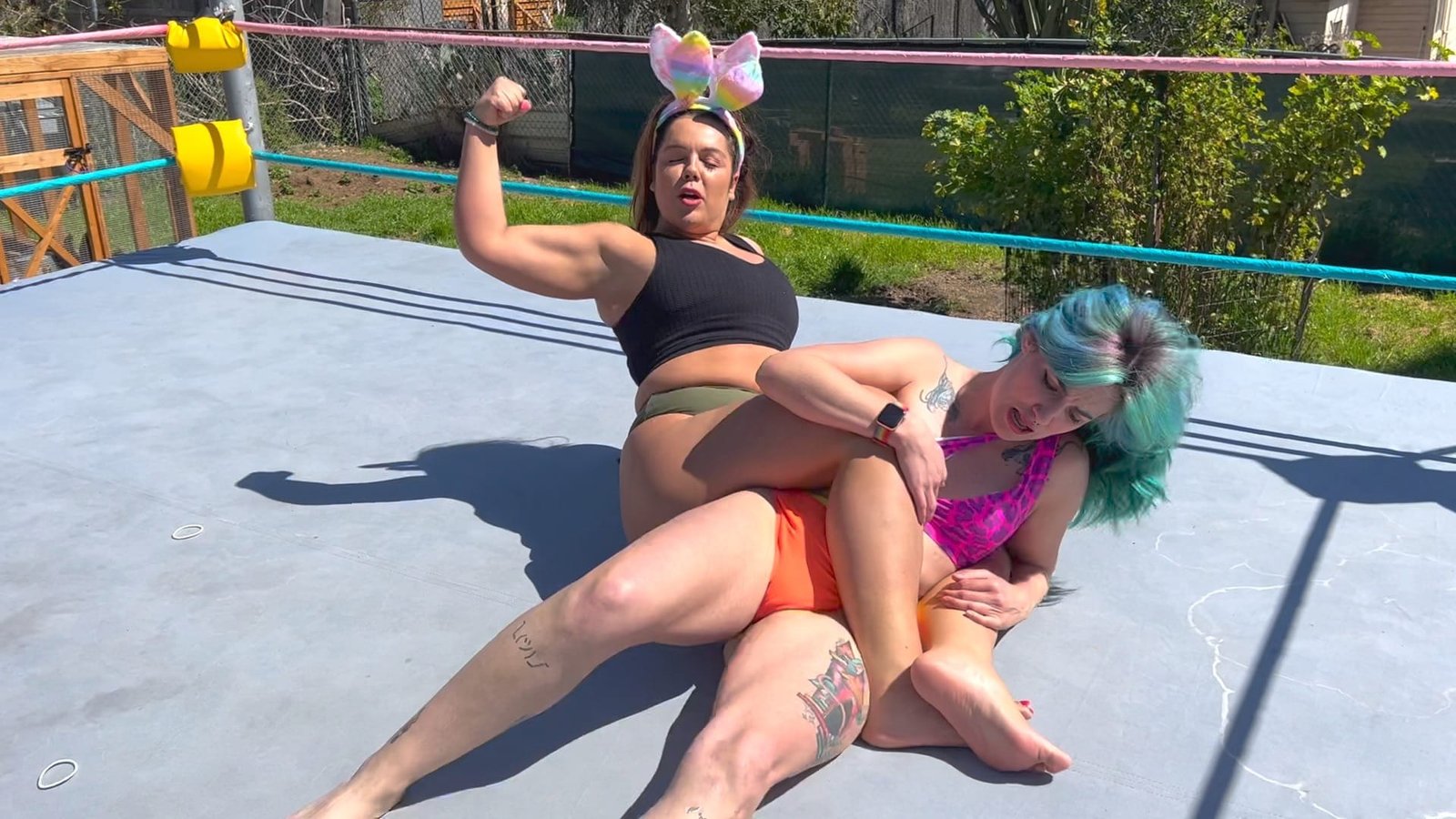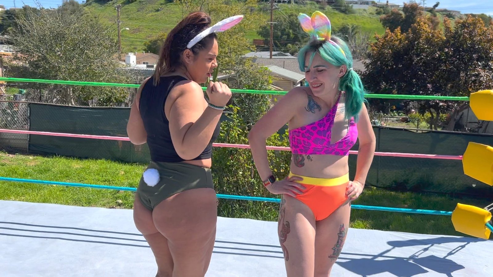Morrigan Moxie is back to jobbing!  She wants to be the cutest bunny, but Nadia Sapphire thinks this is ridiculous.  Nadia takes her bunny ears and tail, and then punishes her with one grueling submission after another. Not available on our Clipstore!