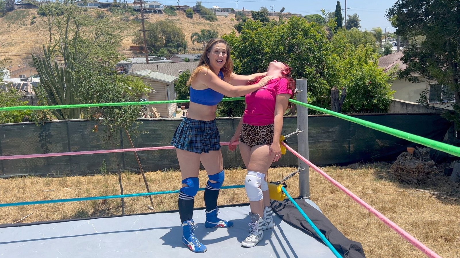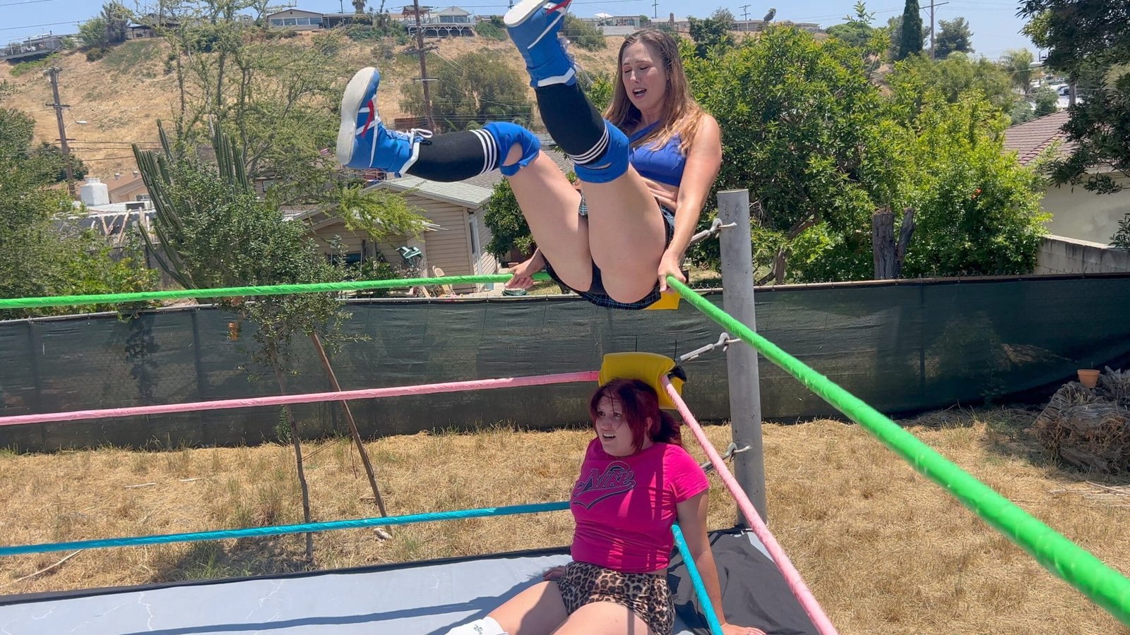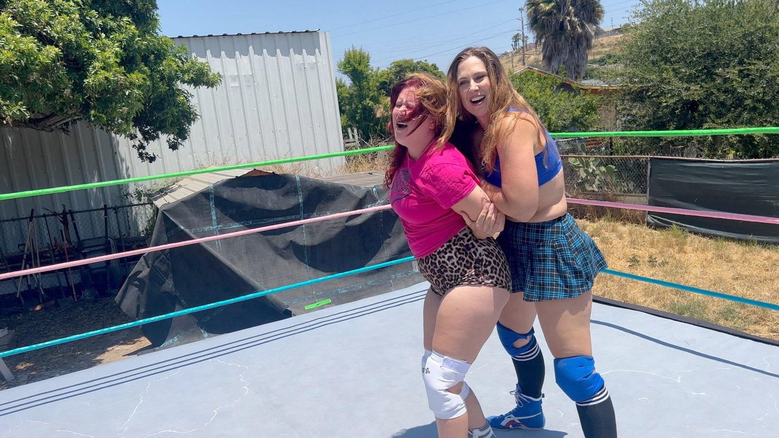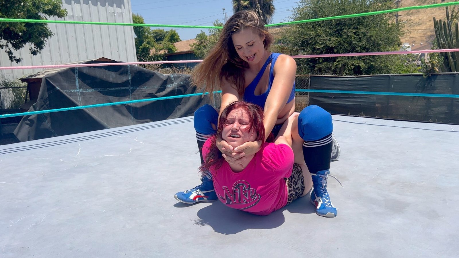 Beckie beats up the new jobber!  She gives her Stinkfaces, a Camel Clutch and a Low Blow, but Hilton says she likes it!