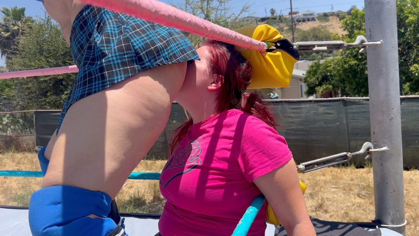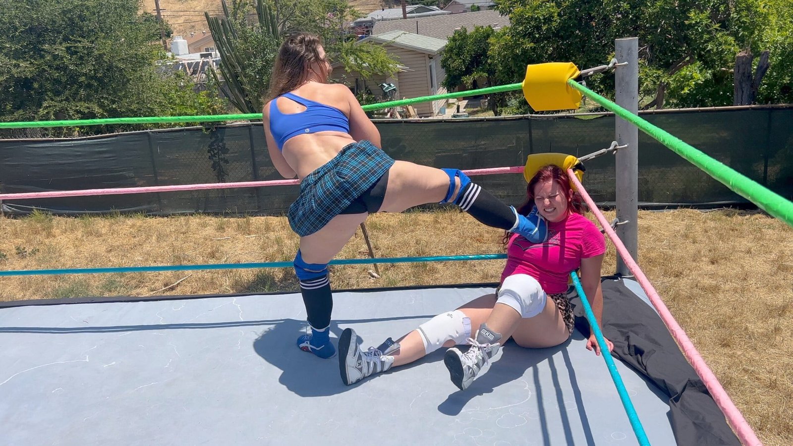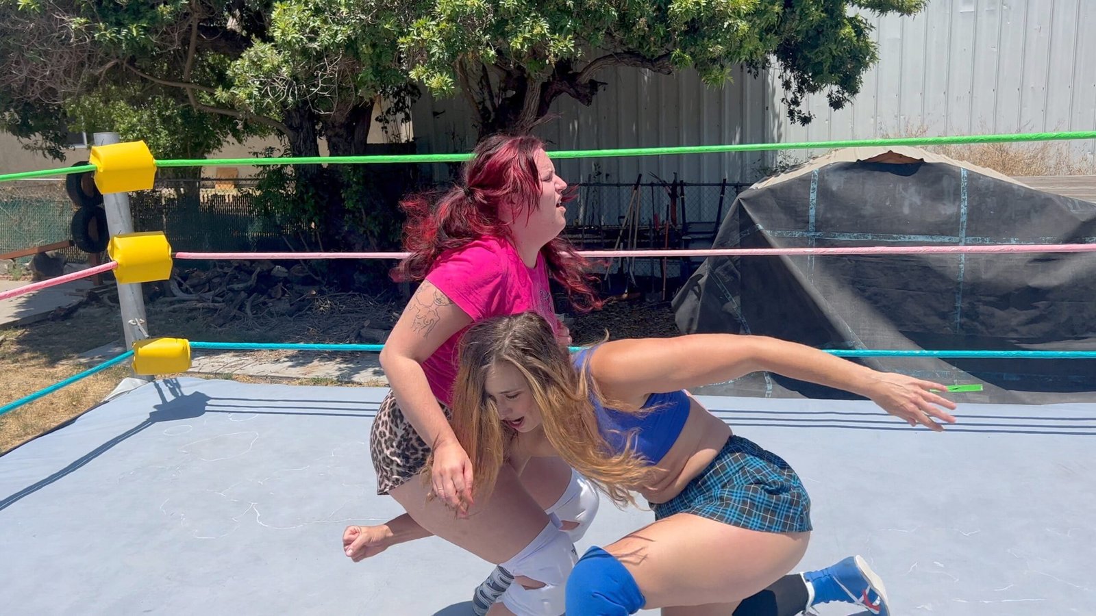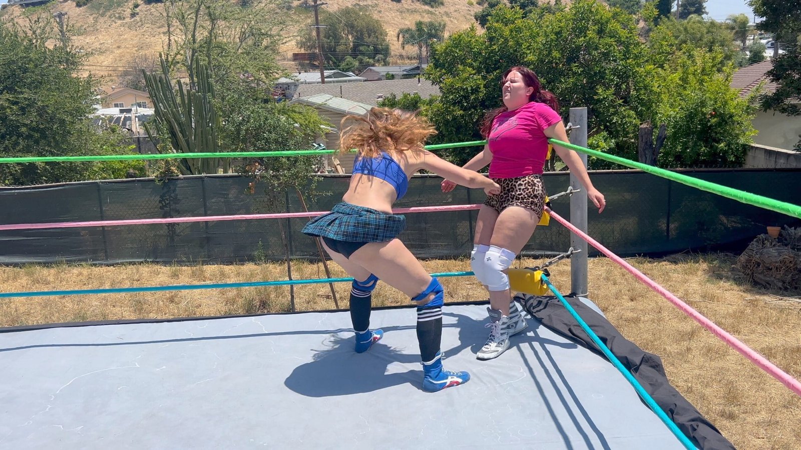Beckie beats up the new jobber!  She gives her Stinkfaces, a Camel Clutch and a Low Blow, but Hilton says she likes it!