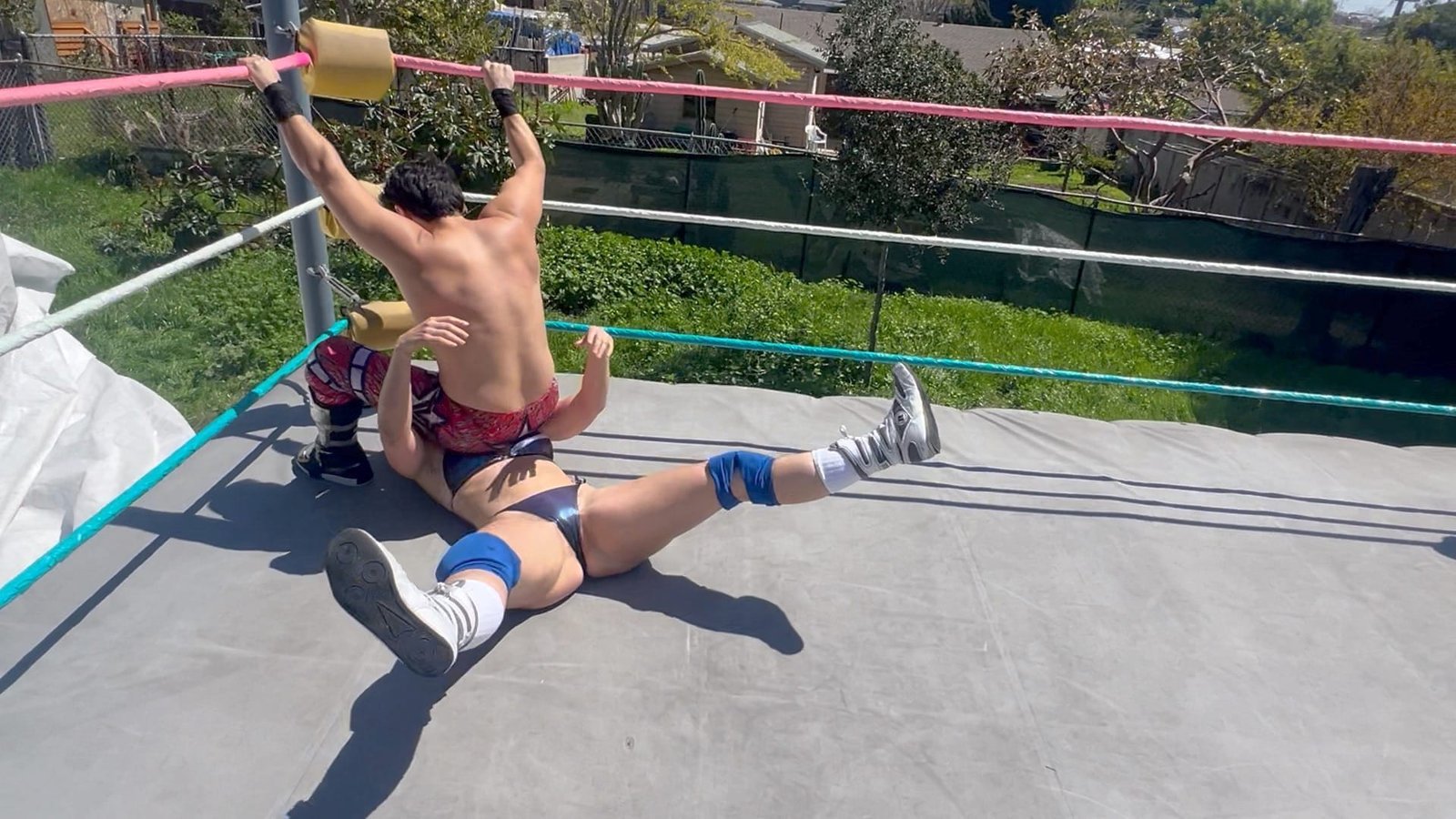 Beckie thinks she can catch Vic off guard but he’s too quick.  He quickly slams her, knocking her unconscious, then delivers a series of devastating leg drops, bonsai drops and elbow drops, in addition to several more body slams and some punches to the face – all while she is passed out in her bikini!  11 min 36 sec