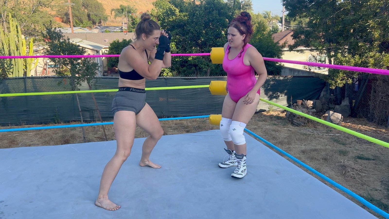 Beckie is training to be a MMA fighter and she really doesn’t like that she has to share the ring with “Pretty in Pink” Pro Wrestler Hilton.  Beckie wants to show Hilton real fighting! 5 min