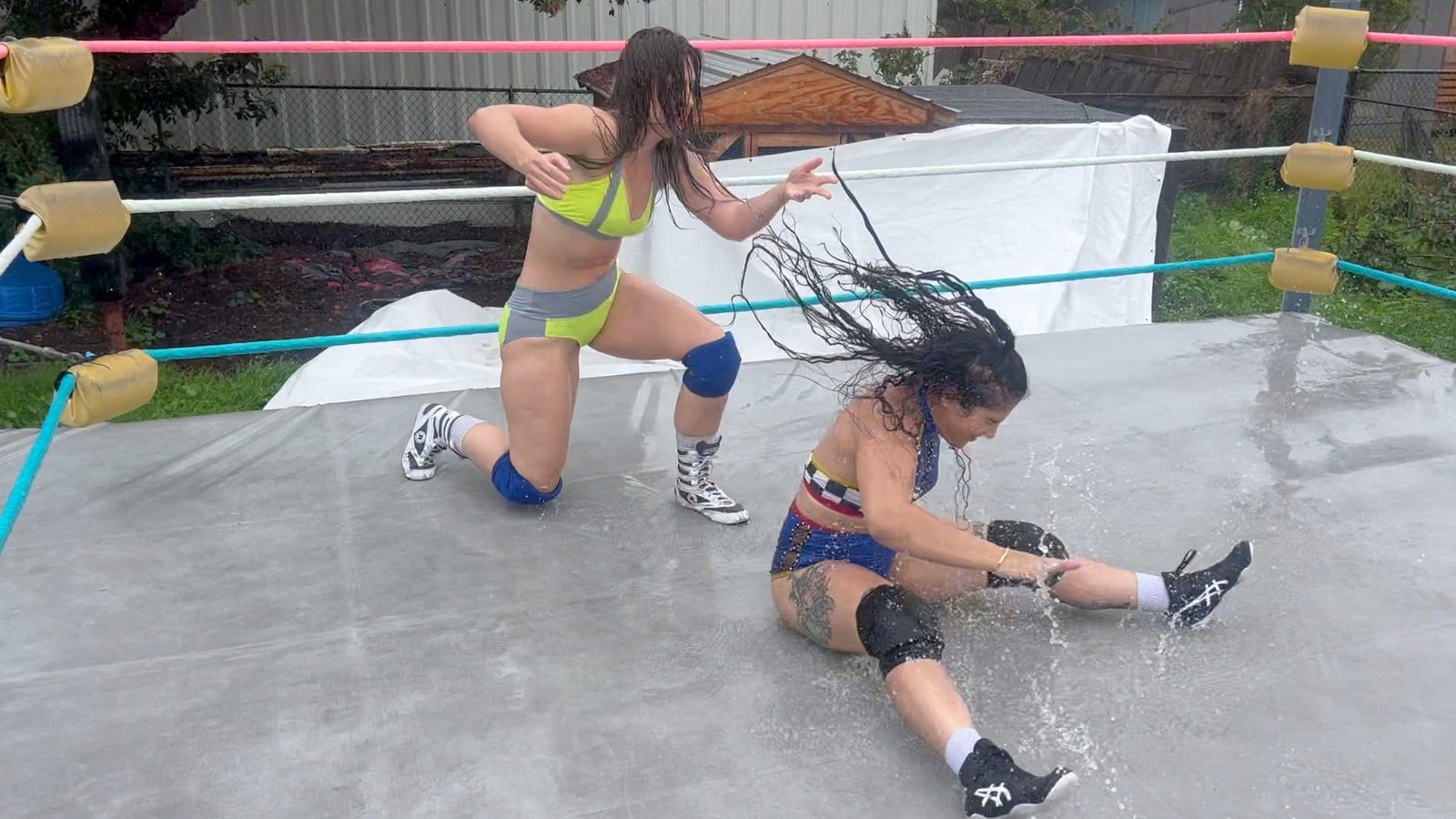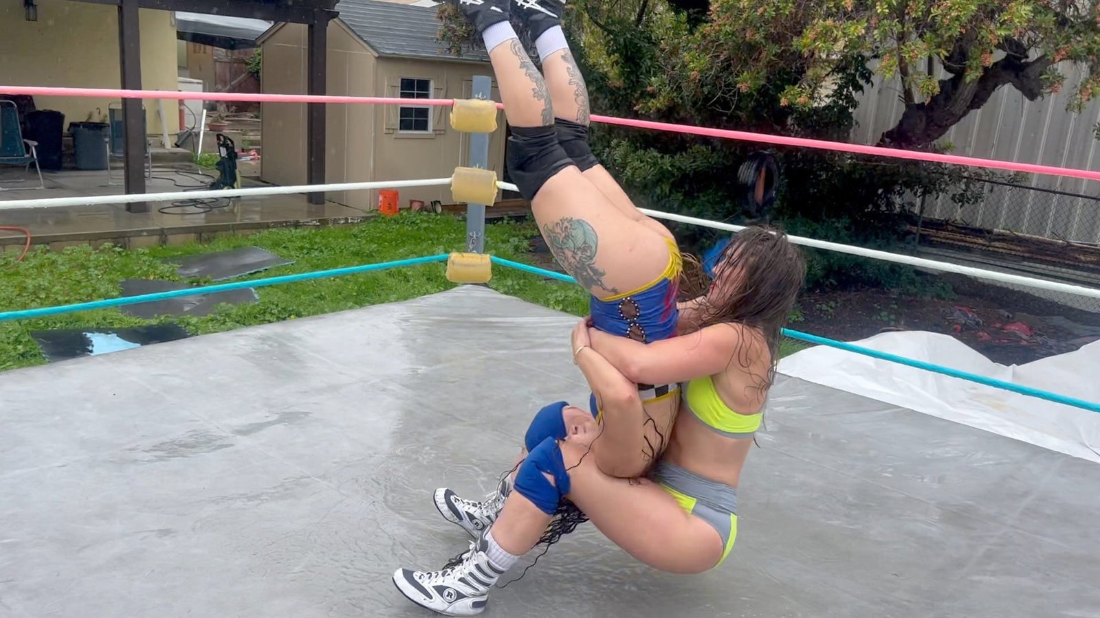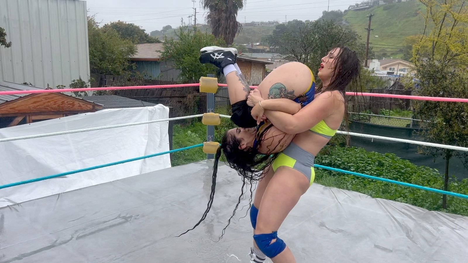 It’s raining in San Diego, CA but that’s going to stop Beckie from giving newcomer Saturn not one, not two, but EIGHT Piledrivers.  That’s right, eight wet, slippery, dangerous Piledrivers!  10 min 11 sec