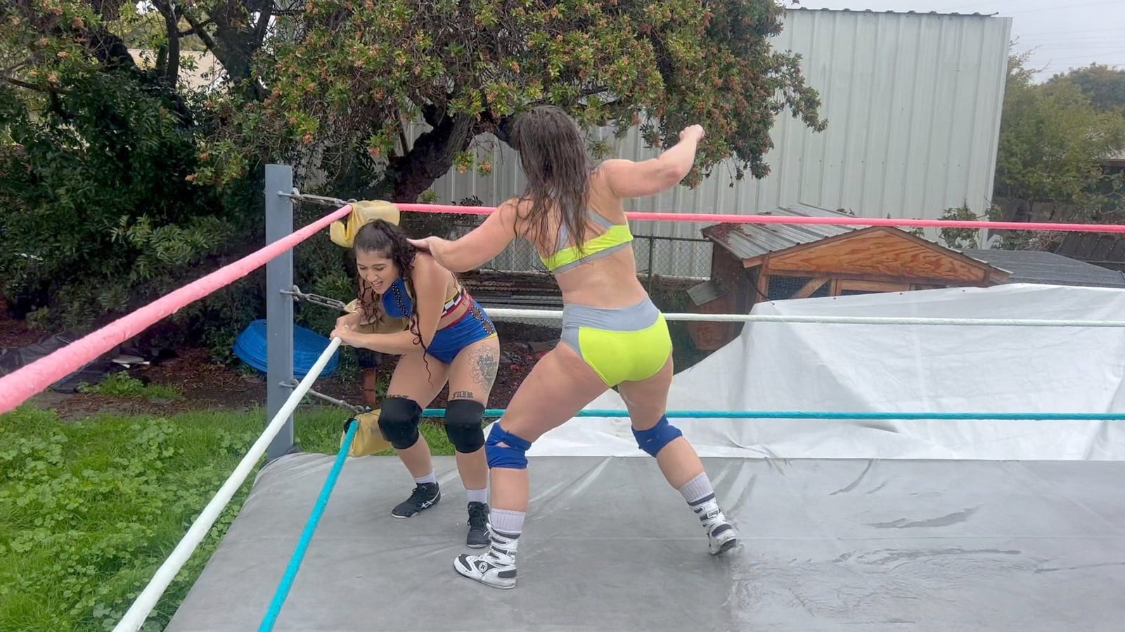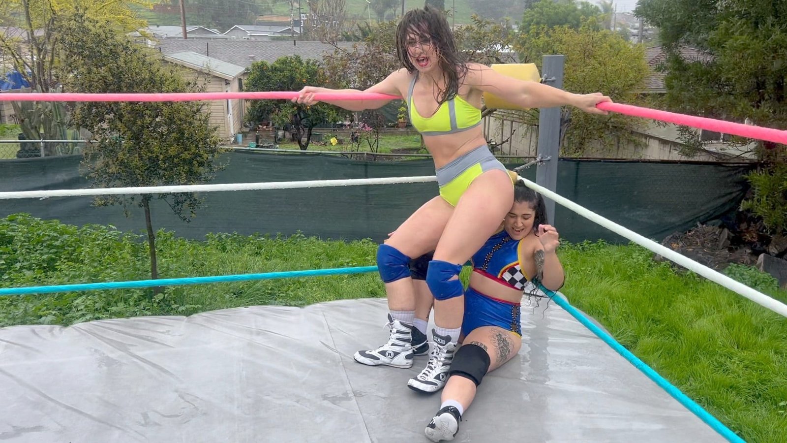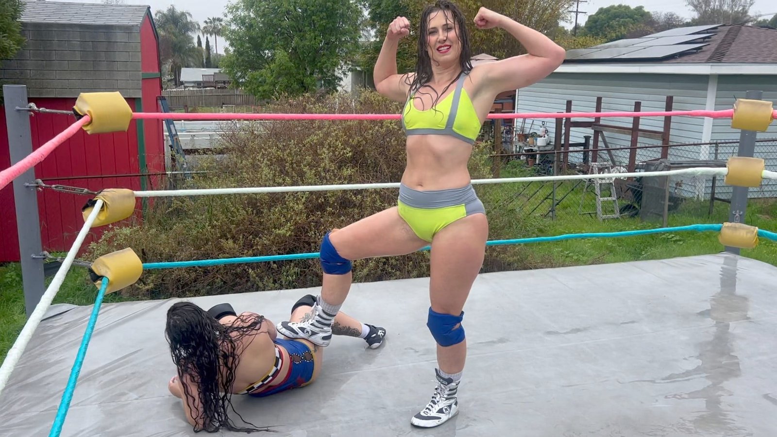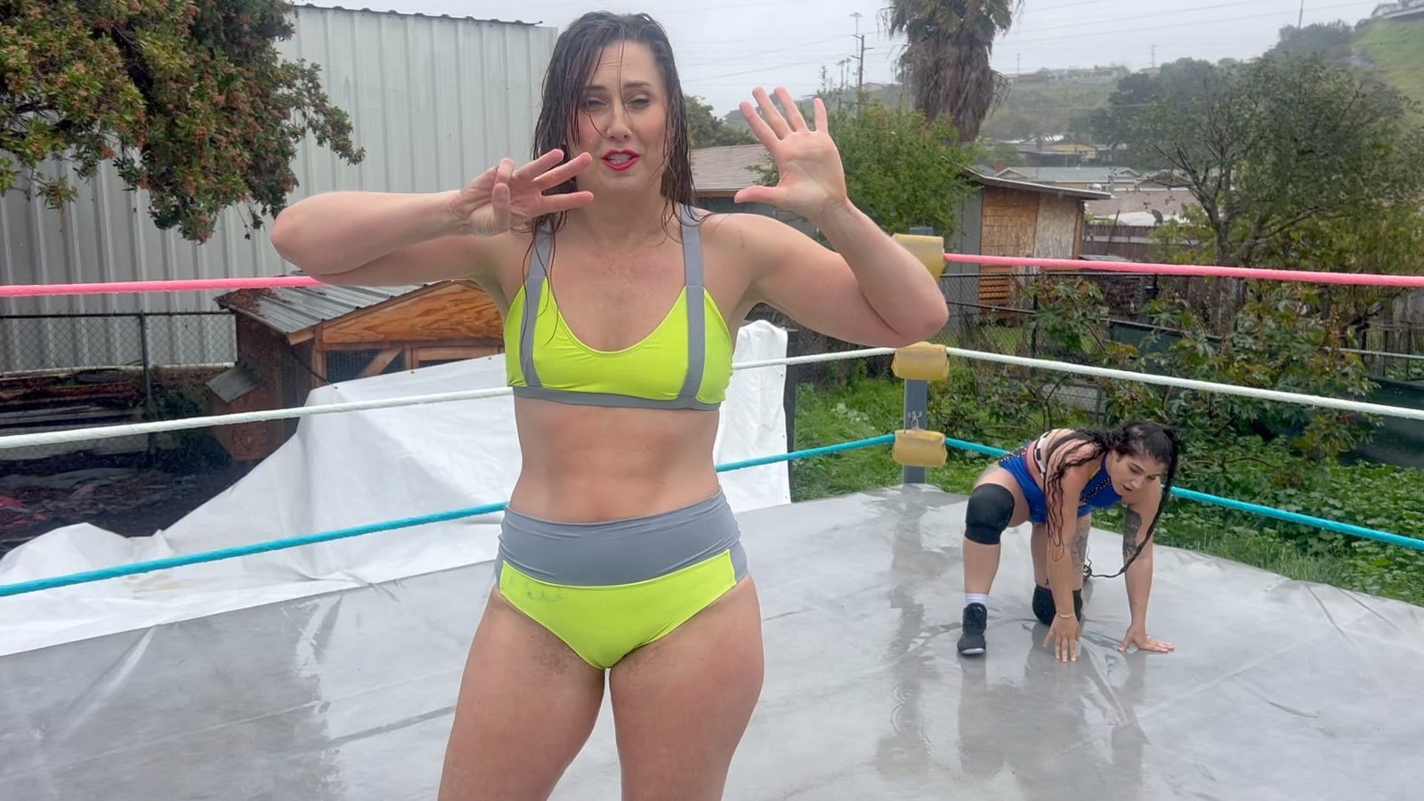 It’s raining in San Diego, CA but that’s going to stop Beckie from giving newcomer Saturn not one, not two, but EIGHT Piledrivers.  That’s right, eight wet, slippery, dangerous Piledrivers!  10 min 11 sec