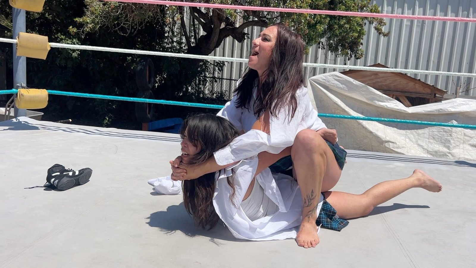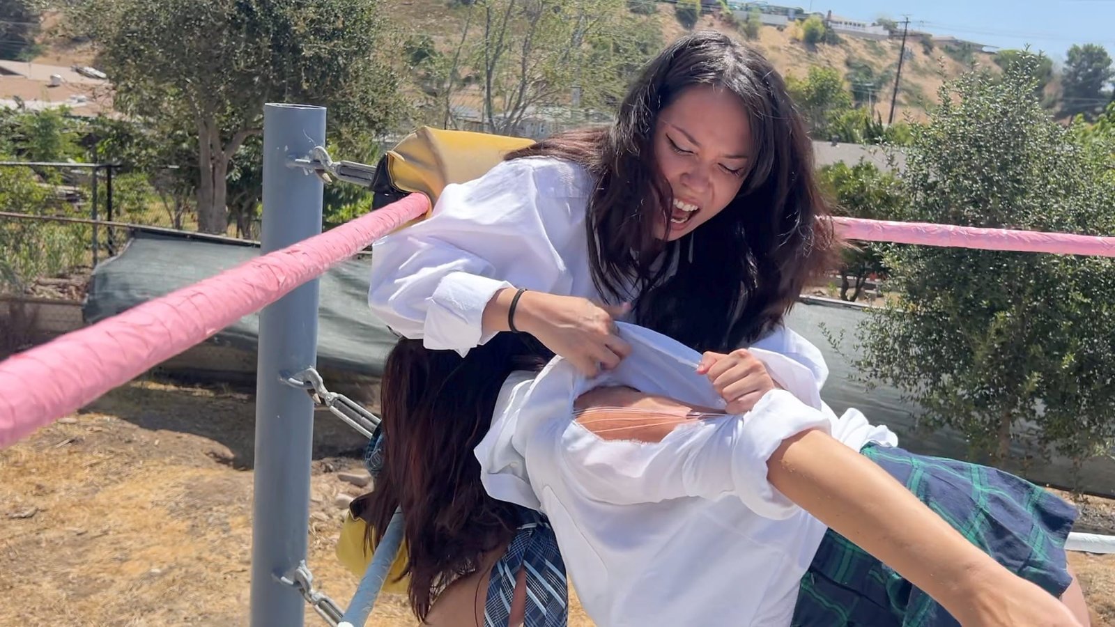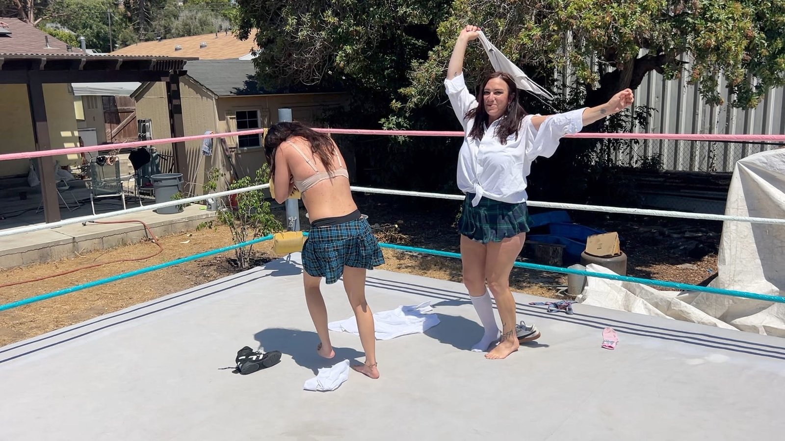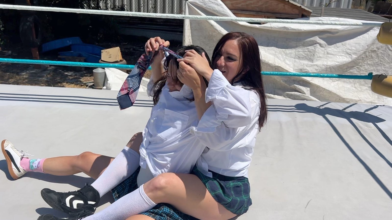 Stevie and Nikki are in college and they both have a crush on the same guy in their math class.  Soon enough they are ripping each other’s uniforms off and wrestling each other!  And by the end one of them is in only their bra and panties and the other loses her bra AND her panties!  16 min 34 sec