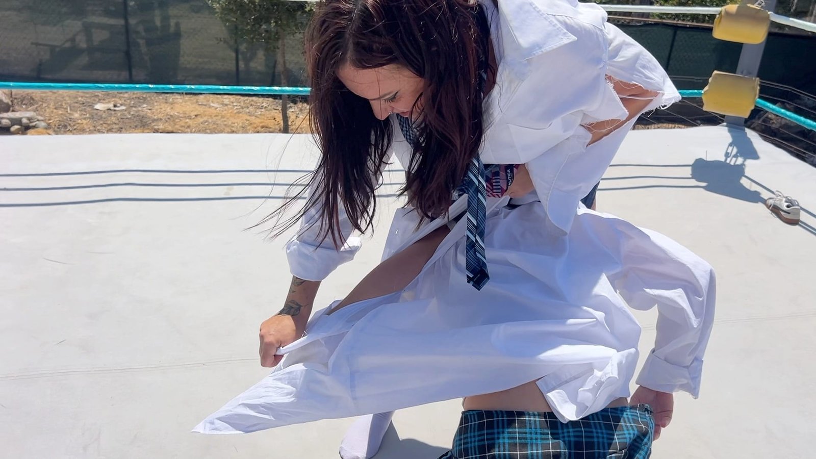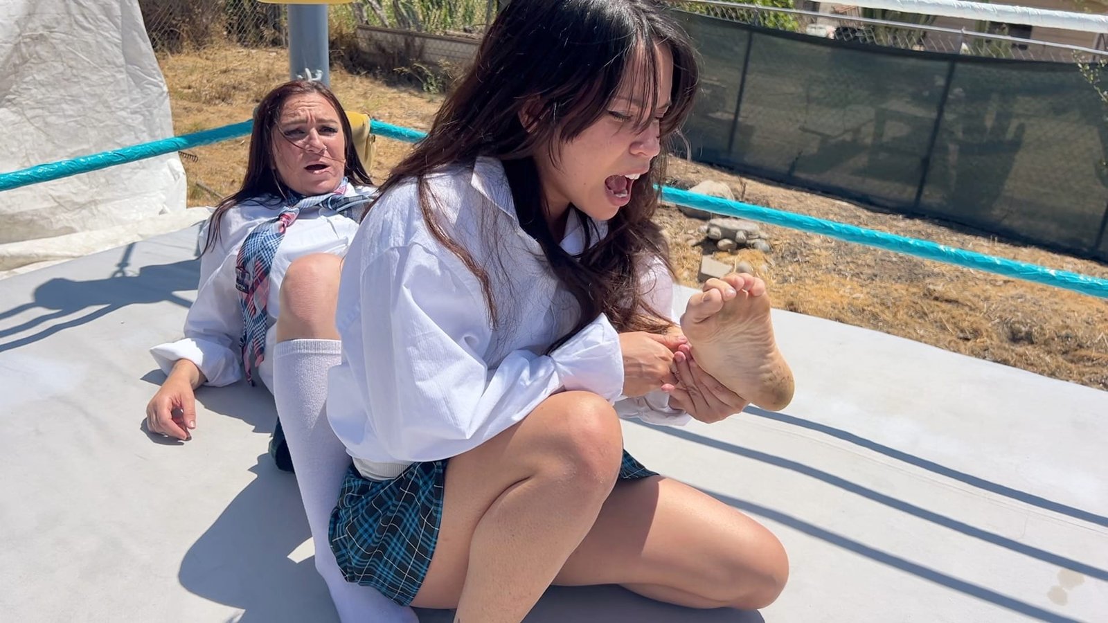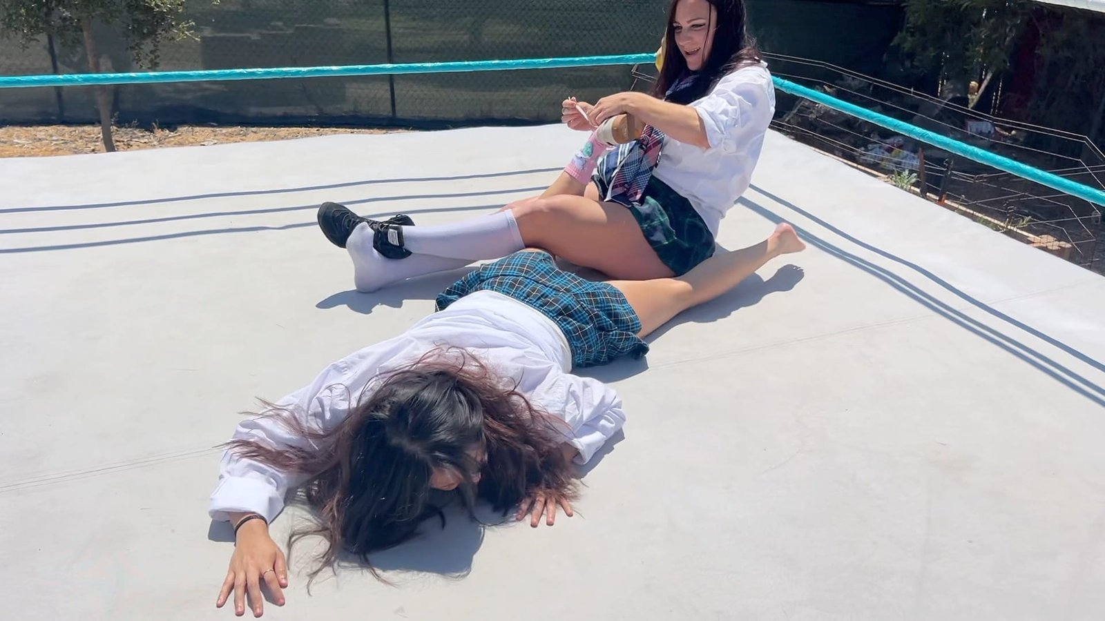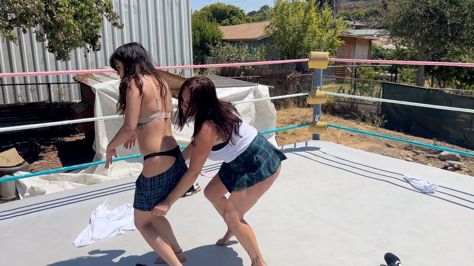 Stevie and Nikki are in college and they both have a crush on the same guy in their math class.  Soon enough they are ripping each other’s uniforms off and wrestling each other!  And by the end one of them is in only their bra and panties and the other loses her bra AND her panties!  16 min 34 sec