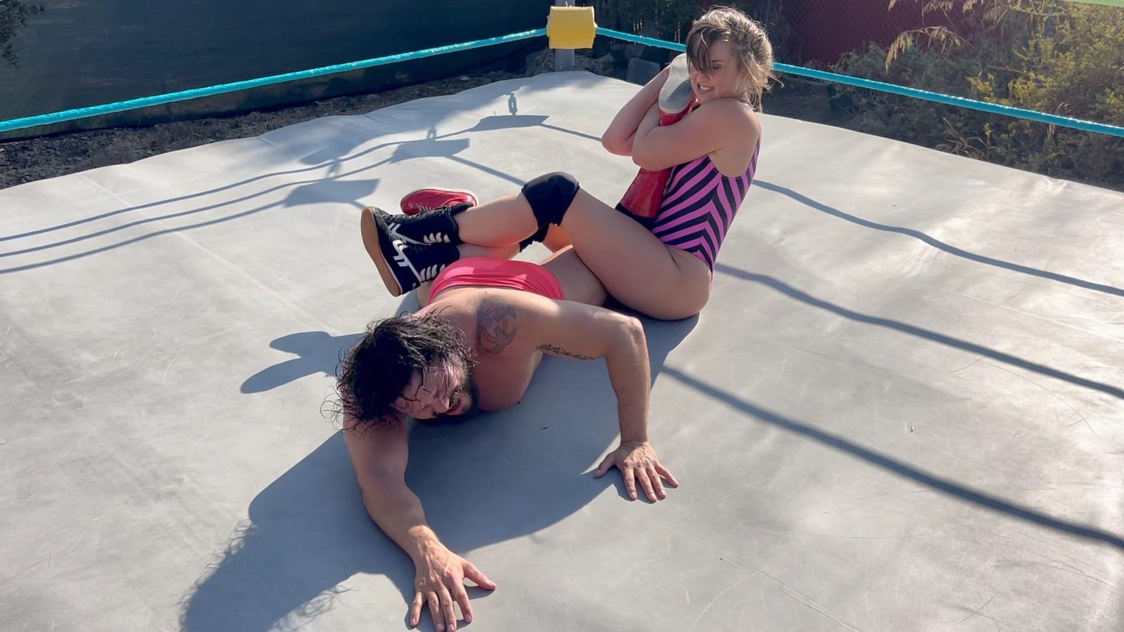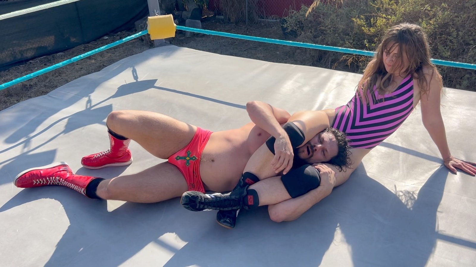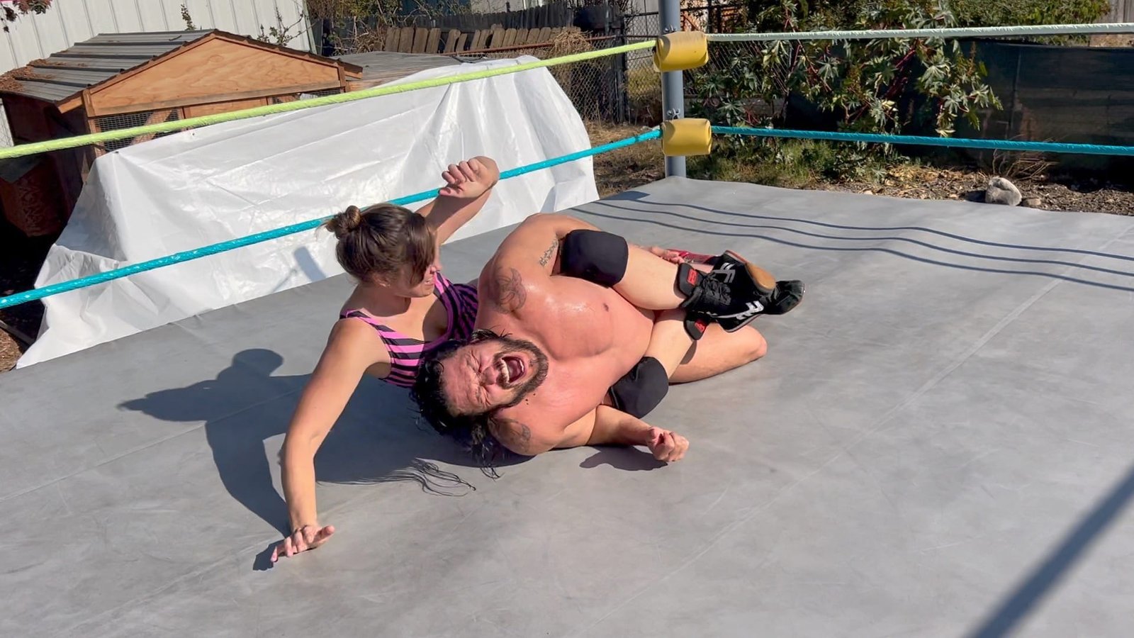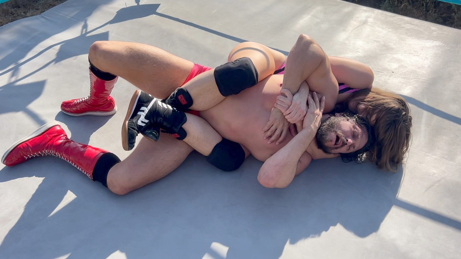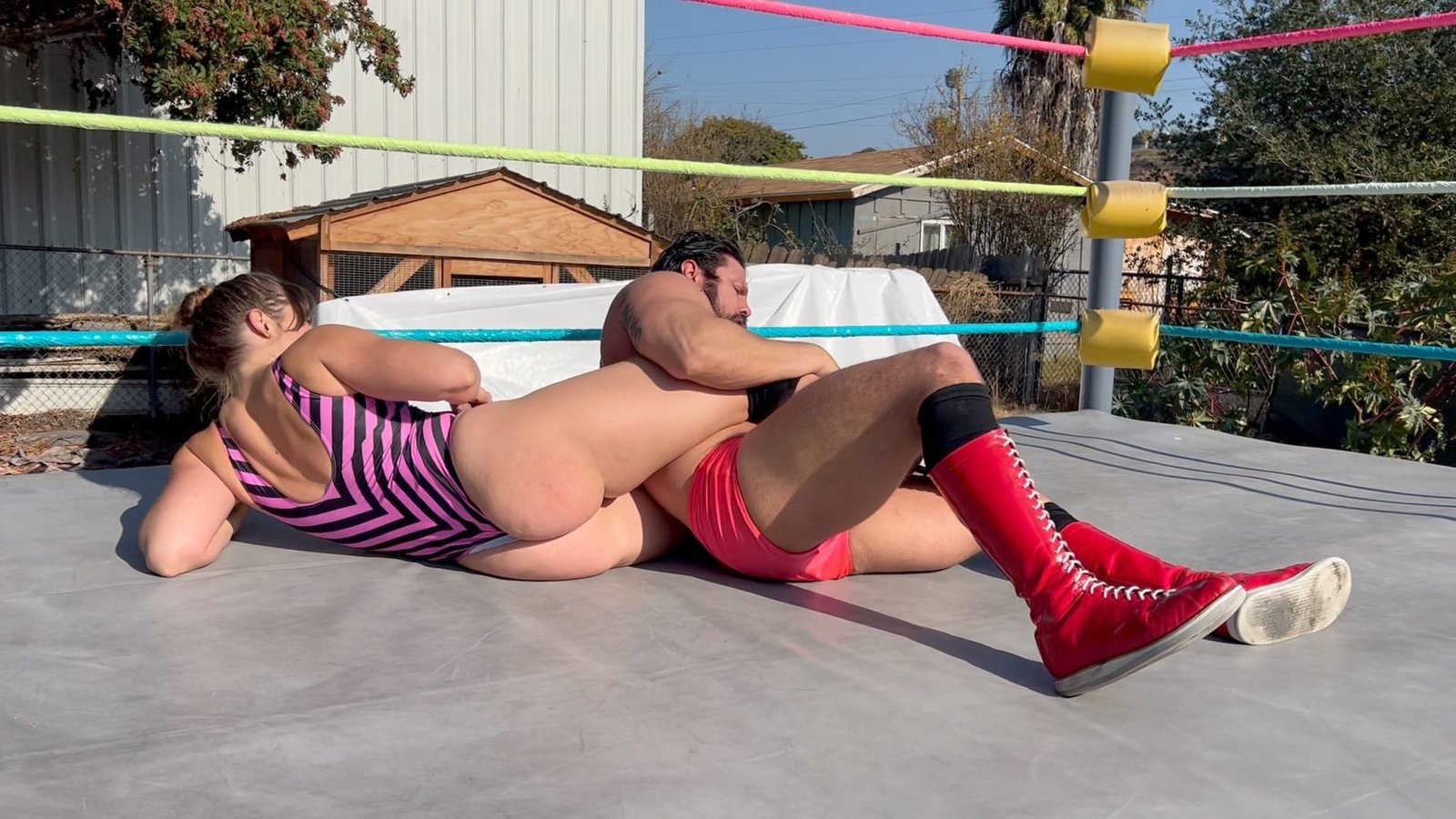 Beckie dominates Tito with head and body scissors, forcing to admit that he skips leg day!  10 min 8 secs