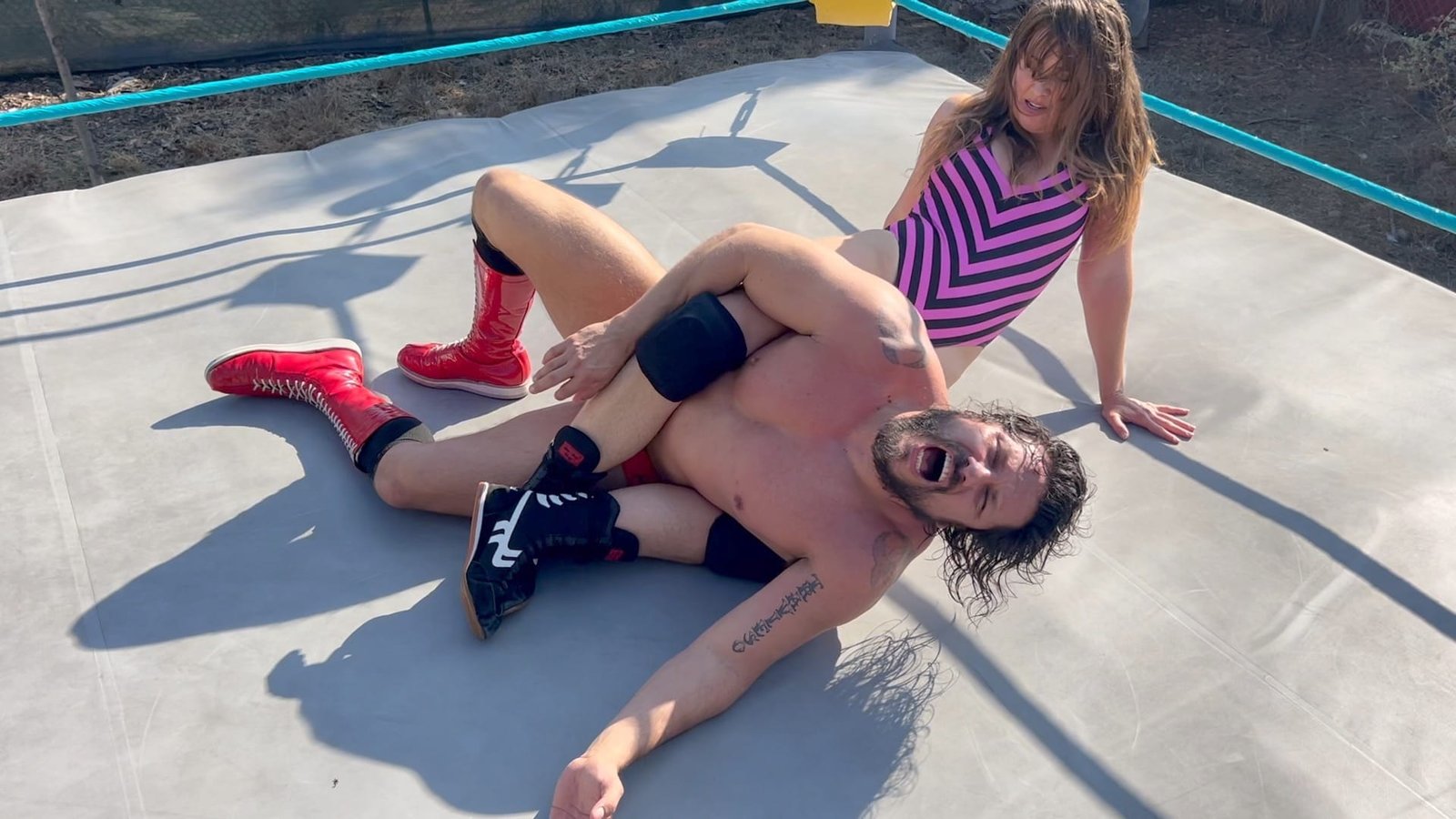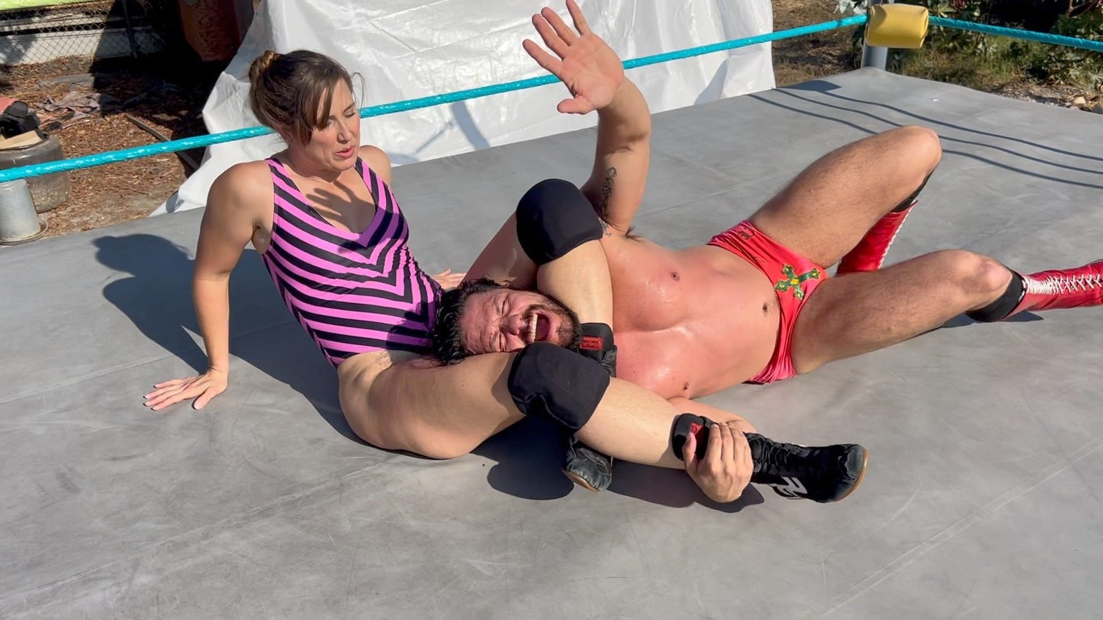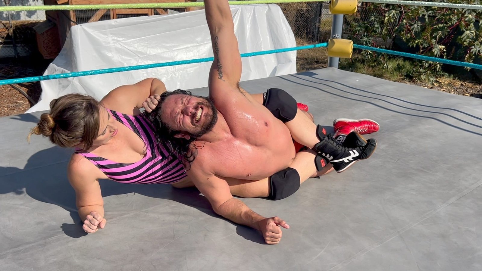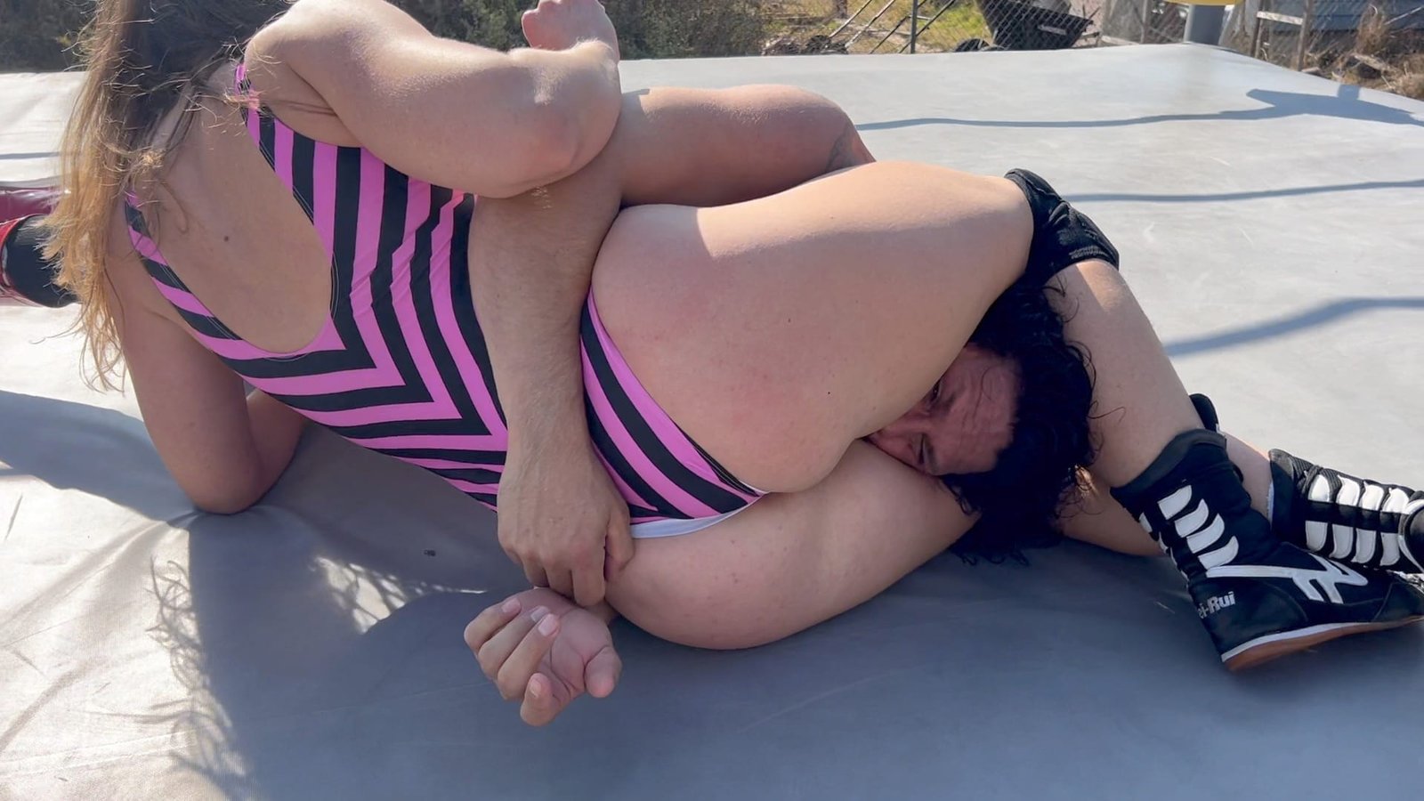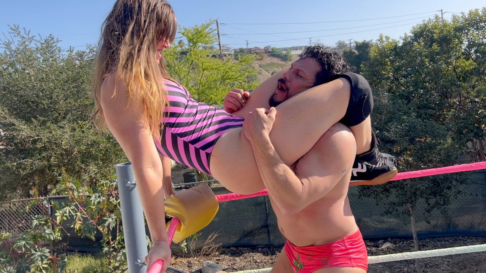 Beckie dominates Tito with head and body scissors, forcing to admit that he skips leg day!  10 min 8 secs